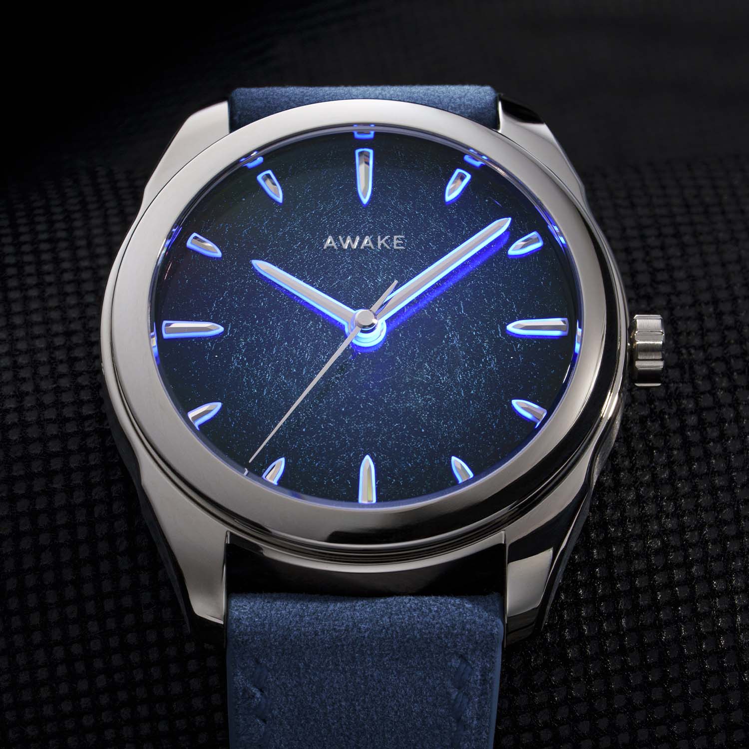 As for the dial, besides the appealing texture and vibrant colours of the Son Mai Silver Leaf Vignette, the layout is the same. This means a rather fascinating luminescence effect. Instead of applying it to the top surfaces of the hands and indices, Awake reverses the formula. The hands and indices are made from a thin, solid base of SLN BGW9, machined and then capped with a faceted, polished steel overlay, functioning like a backlight. All watches come equipped with a strap handmade in France, in Nubuck bull calfskin or suede.
