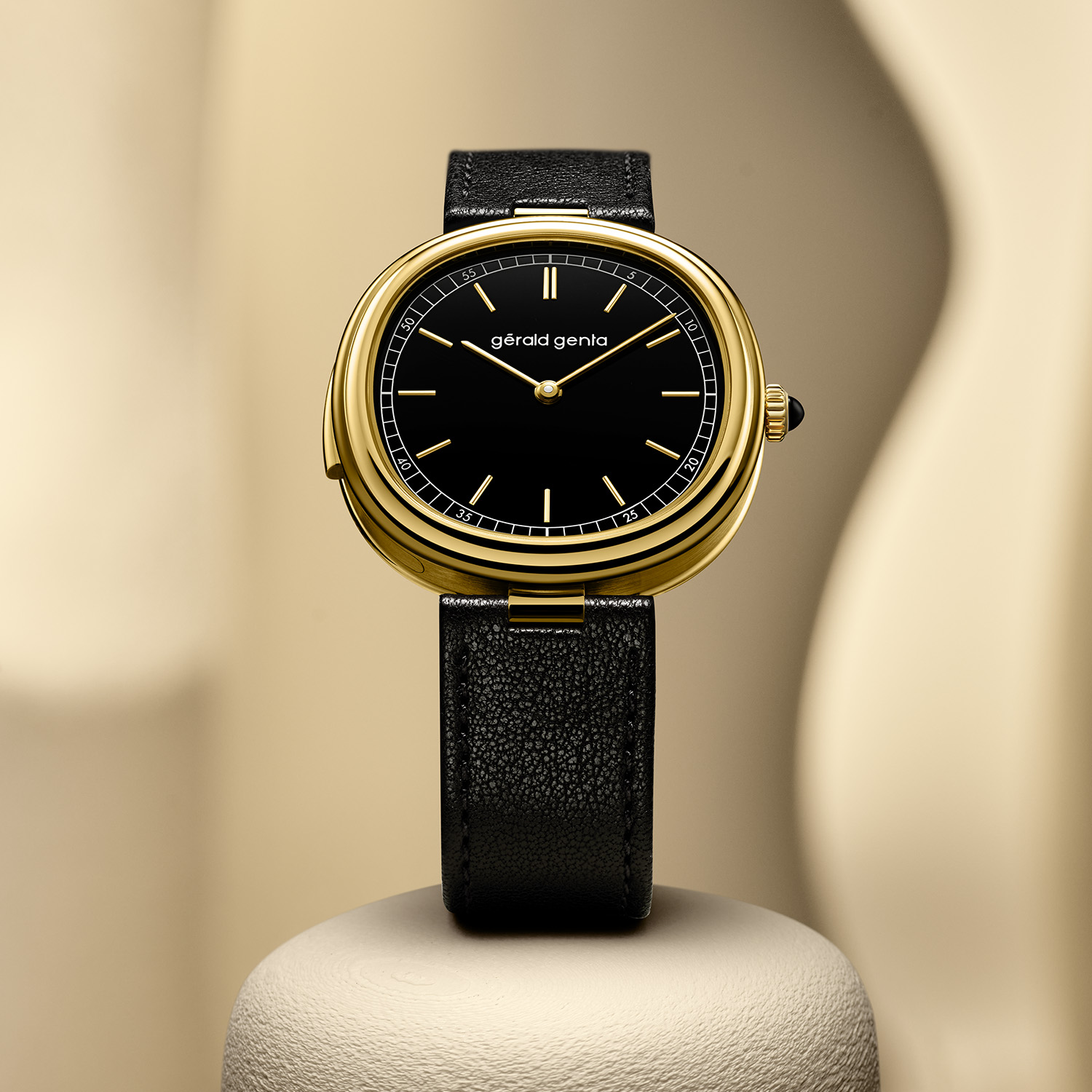 This sleek yet precious, almost jewellery-inspired look continues on the dial of this new Gérald Genta Minute Repeater. Bordering on minimalist, it, however, offers great contrast with the yellow gold case thanks to its polished black onyx base – Genta was fond of stone dials. A white railroad minute track frames the dial, with an inner segment shaped as a circle, the indexes following this round profile, while the outer segment echoes the shape of the case. Discreet yet highly contrasted yellow gold, polished and rounded hands and applied markers give the finishing touches to the dial.