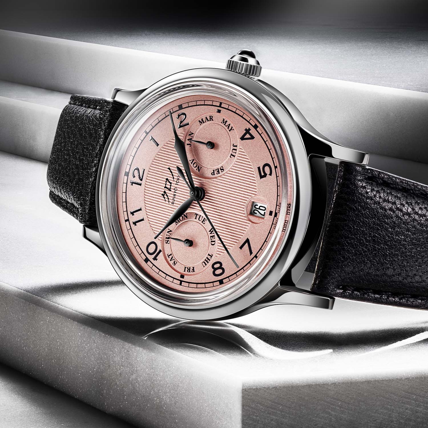 A calendar complication paired with an elegant textured salmon-coloured dial.