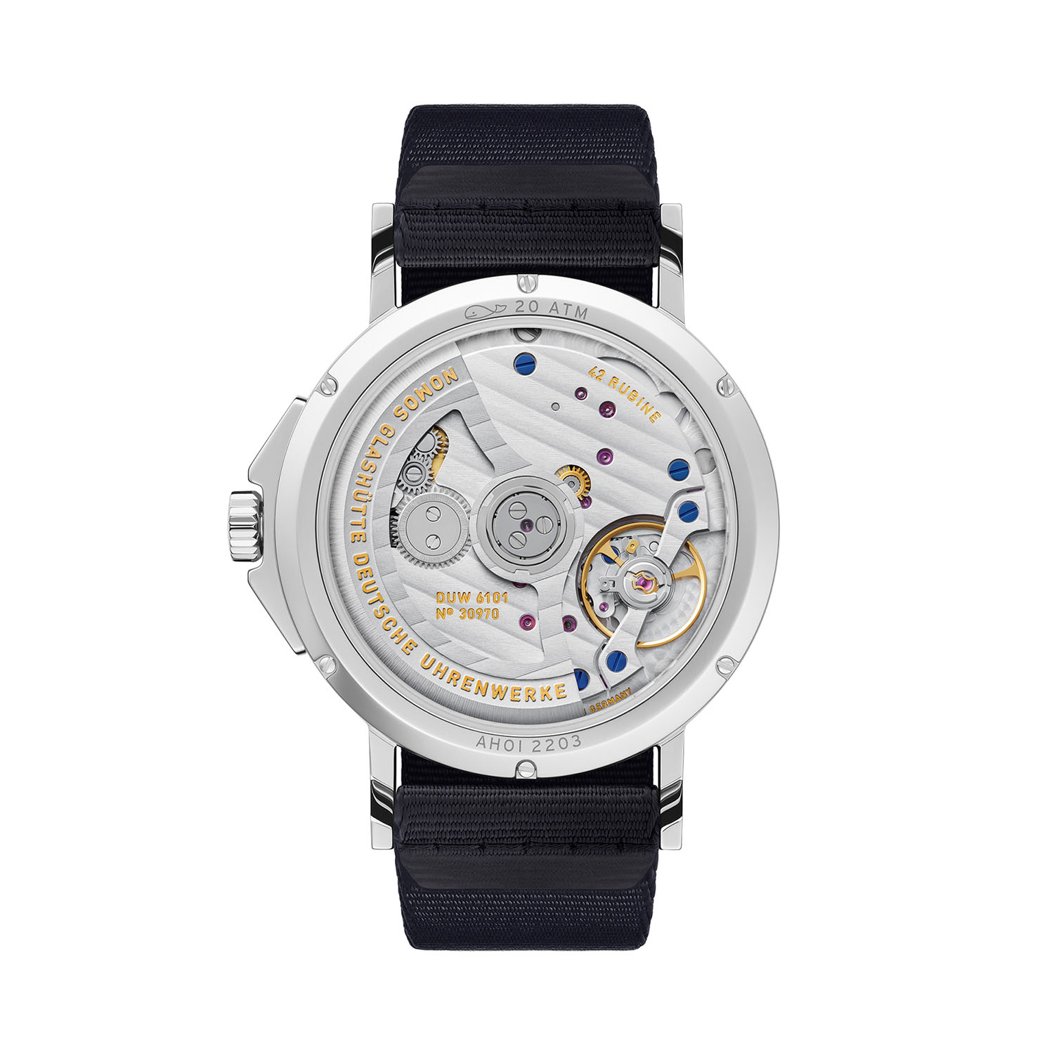 The Ahoi 38 is paired with a sporty blue-black textile strap with a winged steel clasp. Thanks to the drilled holes in the lugs, the strap can be easily switched. The Nomos Ahoi with a closed caseback retails for EUR 3,720, and with a sapphire caseback for EUR 4,020. More information at nomos-glashuette.com.