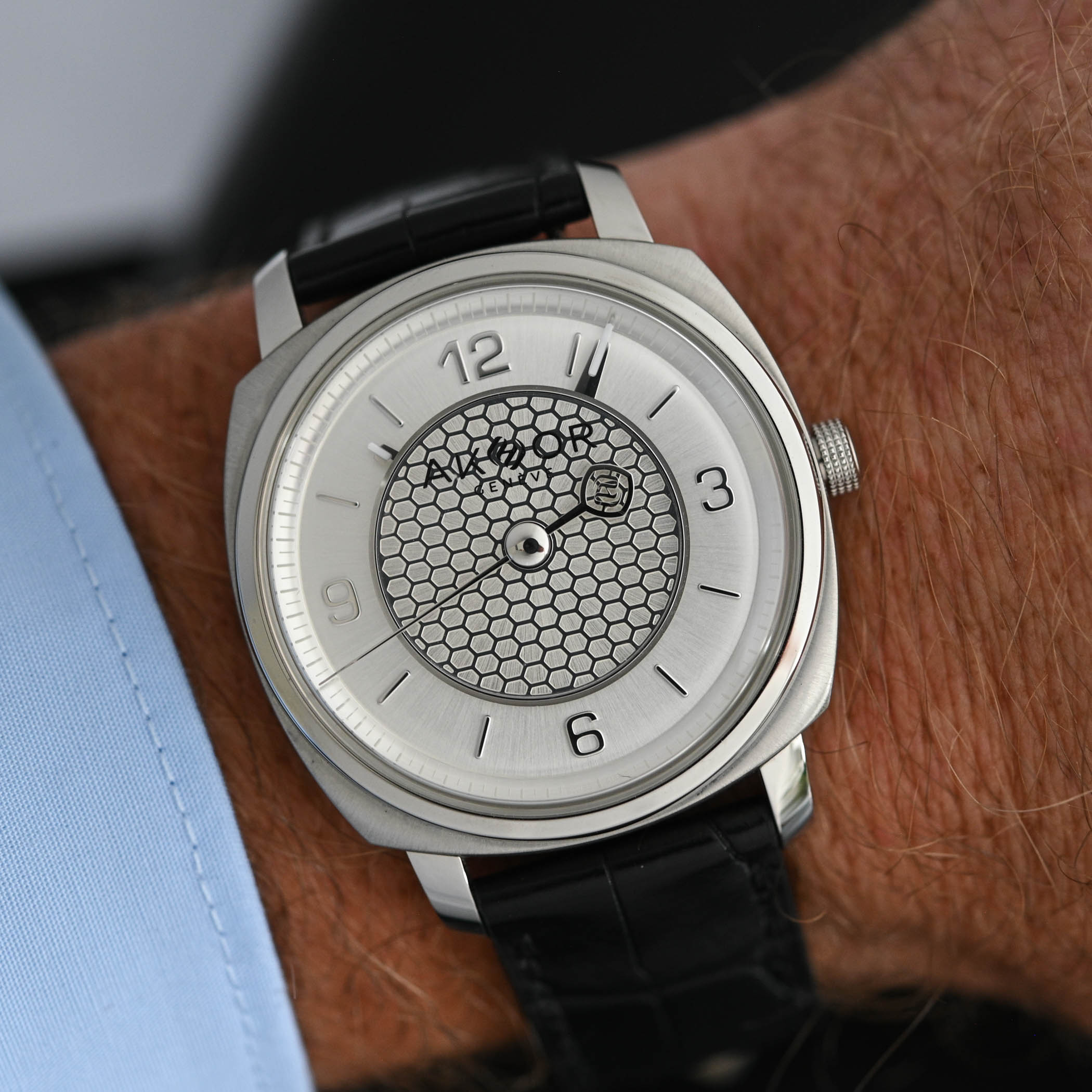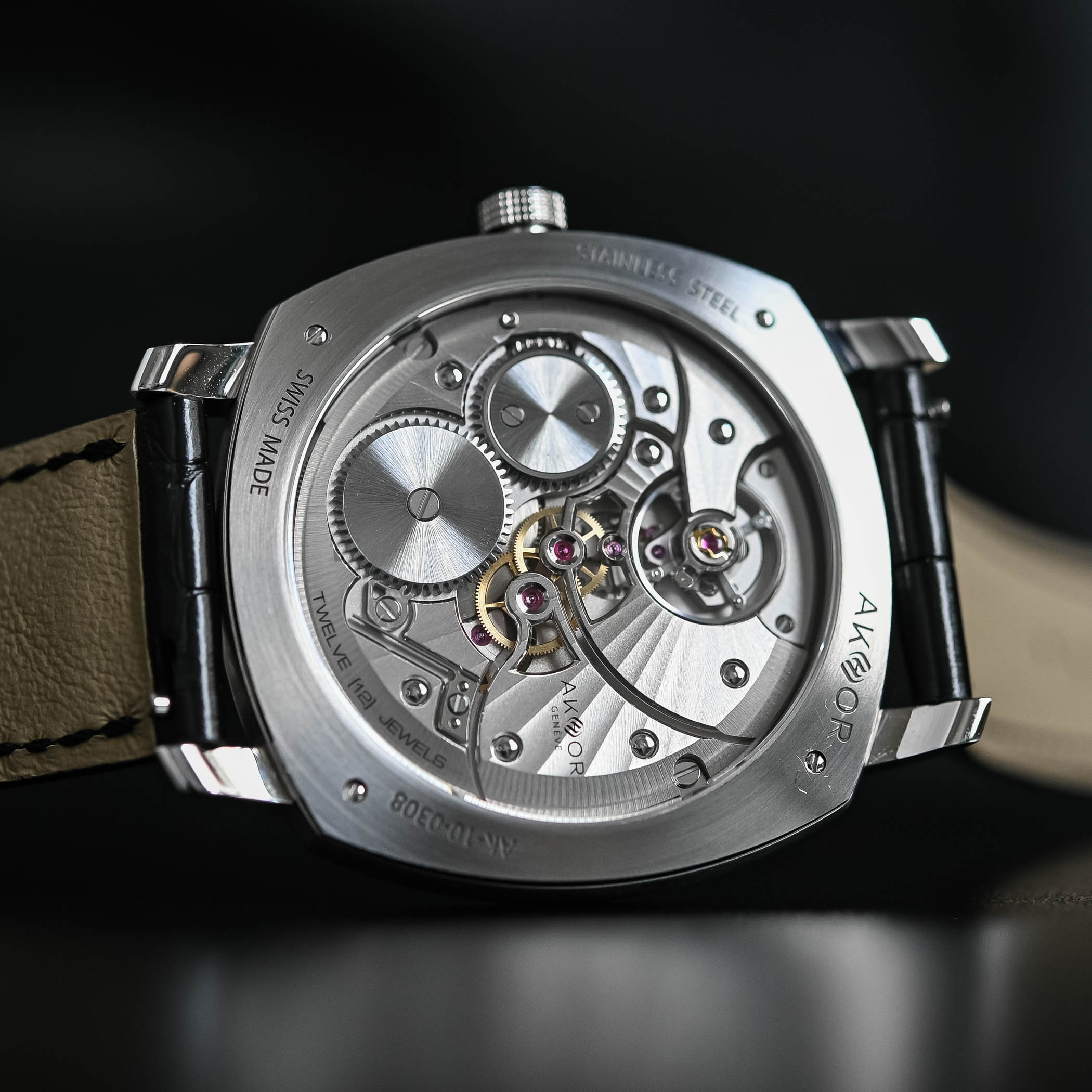Turning the watch over, the exhibition caseback, secured by four screws, reveals the in-house hand-wound calibre AK10 (developed with the support of Daniel Martinez, a consultant in the development of movements and complications for both independent and established brands). The idea was to be as independent from a creative and production standpoint, as well as to build a platform that could accommodate future developments and complications.