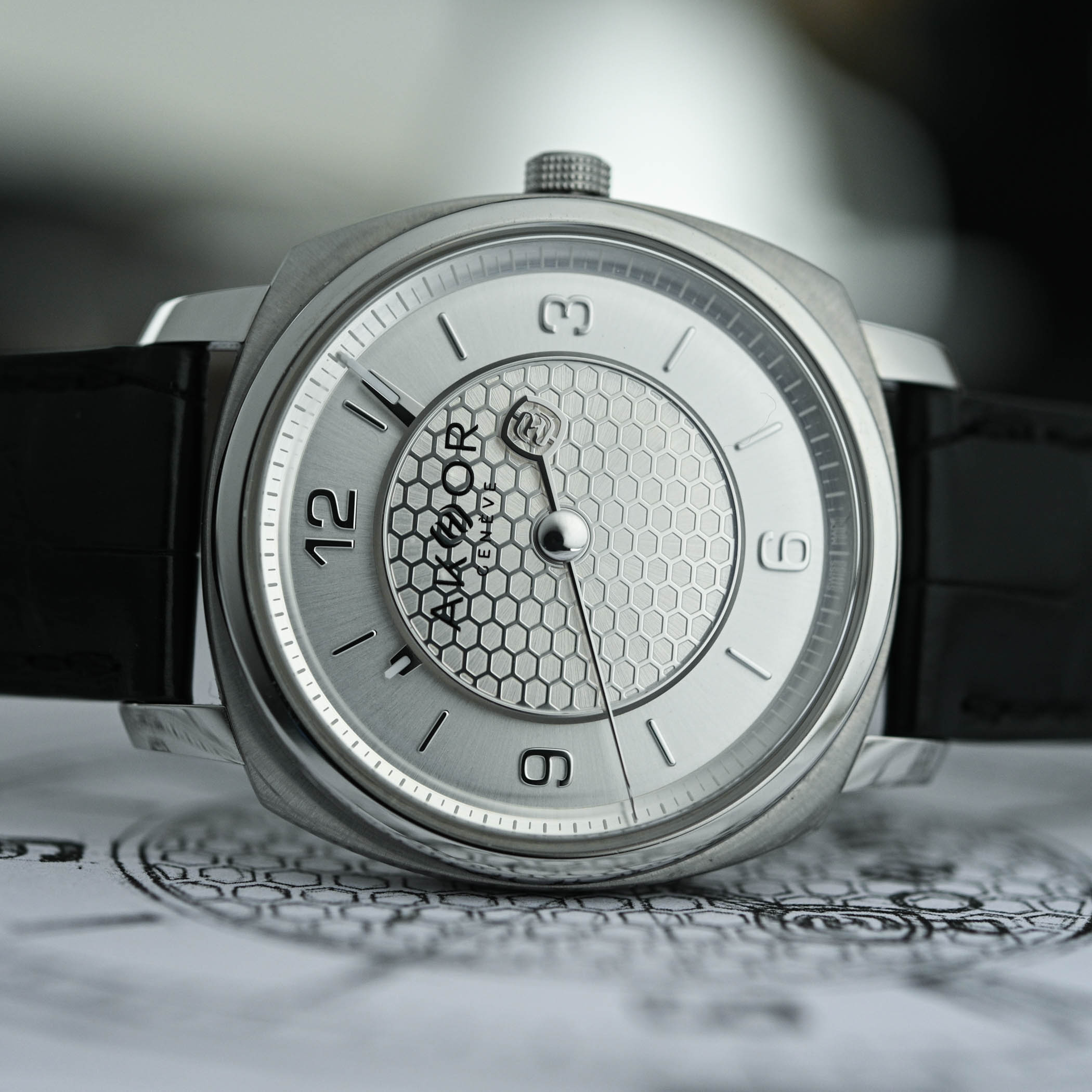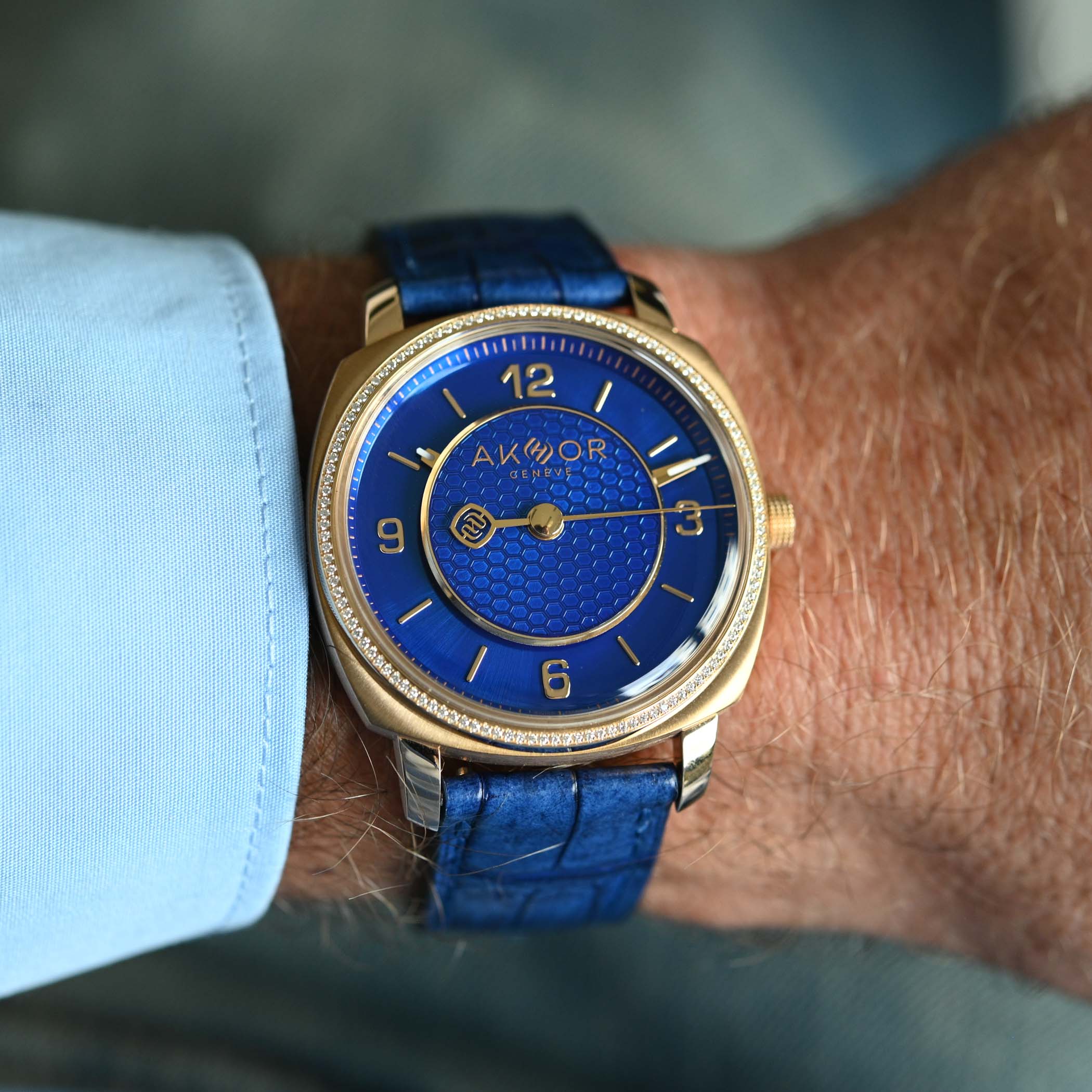 The Akhor Le Temps en Equilibre (Time in Balance in French) is born from a poetic vision of time and its fleeting nature. This new watch reveals the hours and minutes only partially, as if suspended in motion. The passing indications remind us that time is never entirely ours to grasp. Much like the mysterious clocks of old, it offers not just the measure of time but an invitation to contemplate its mystery. From a technical perspective, the concept is brought to life by a system developed and patented by Clamax, a watch component manufacturer based in Geneva and founded in 1988, Akhor’s production partner company. A two-level dial architecture reveals only partially the hour and minute hands that rotate around a central pillar and under the upper dial plate. The dial is available in either a sunburst or honeycomb finish, in various colours: black, white, blue, green, and brown. There are also diamond-set versions (280 brilliant-cut diamonds, approx. 0.85cts).