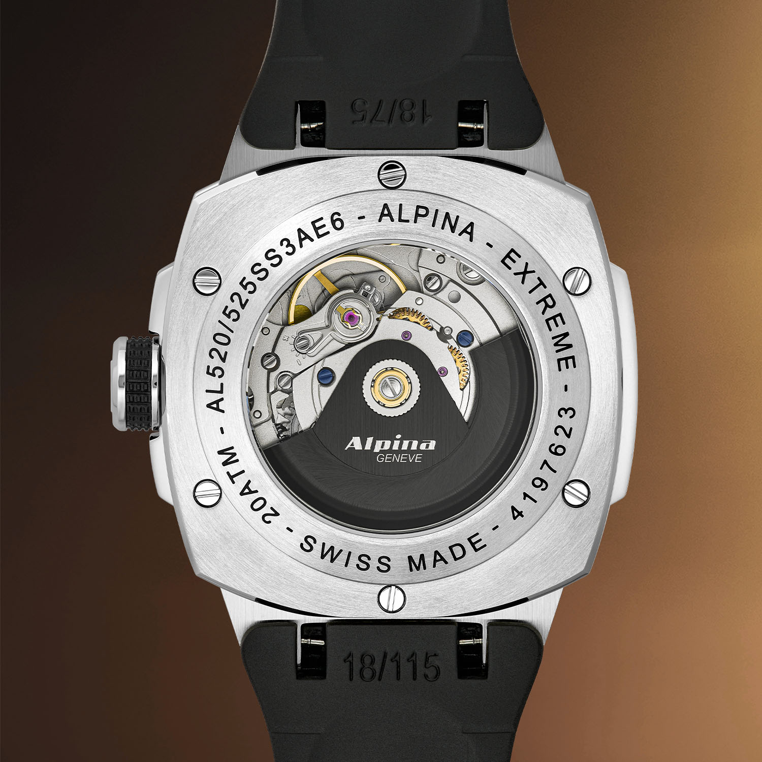 The new Alpiner Extreme Automatic California references have a diameter of 39mm, a length of 40.5mm and a height of 11.5mm. The bold, 200m water-resistant stainless steel case has a cushion-shaped base with rounded edges and is topped by a fixed round bezel with six exposed Alpina screws. The dynamic finishes accentuate the architecture with a pronounced vertical brush on the bezel and lugs, a circular brush on the case and polished bevels, screws and lateral bumpers. The large screw-down crown features a black rubber cladding to enhance grip with a raised chequered pattern that matches the rubber strap.