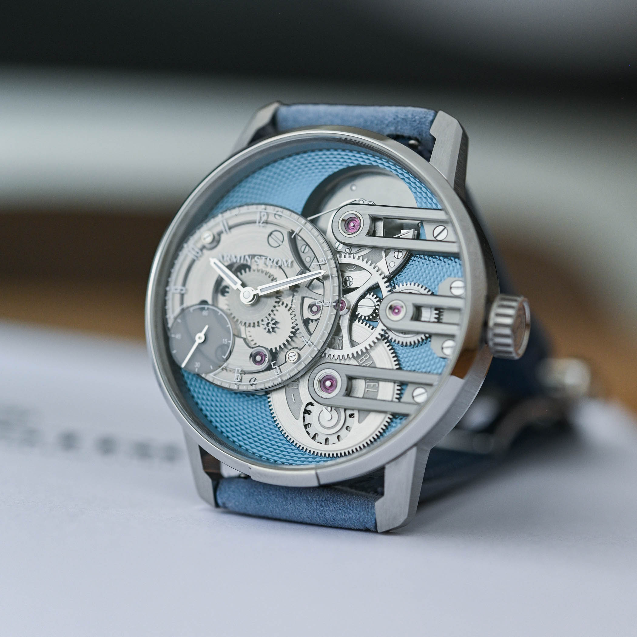 The richly textured mainplate is decorated with a barley grain hand-guilloché pattern performed by artisans in Kari Voutilainen’s dial atelier (Comblémine SA), followed by a 3D PVD process to produce the light blue colour. Although the time indications are off-centred, the dial has a pleasing symmetry with the three openworked finger bridges on the right securing the linear components. The bridge at 1 o’clock secures the round aperture of the micro-rotor, forming a visual counterweight to the bridge over the equal-force barrel at 5 o’clock.