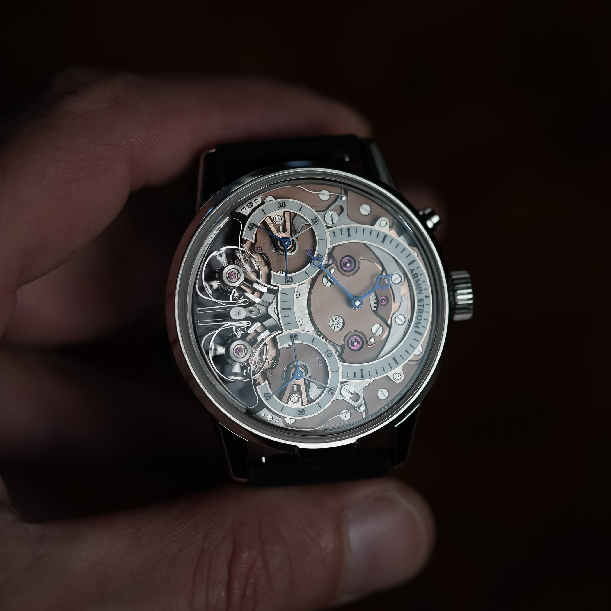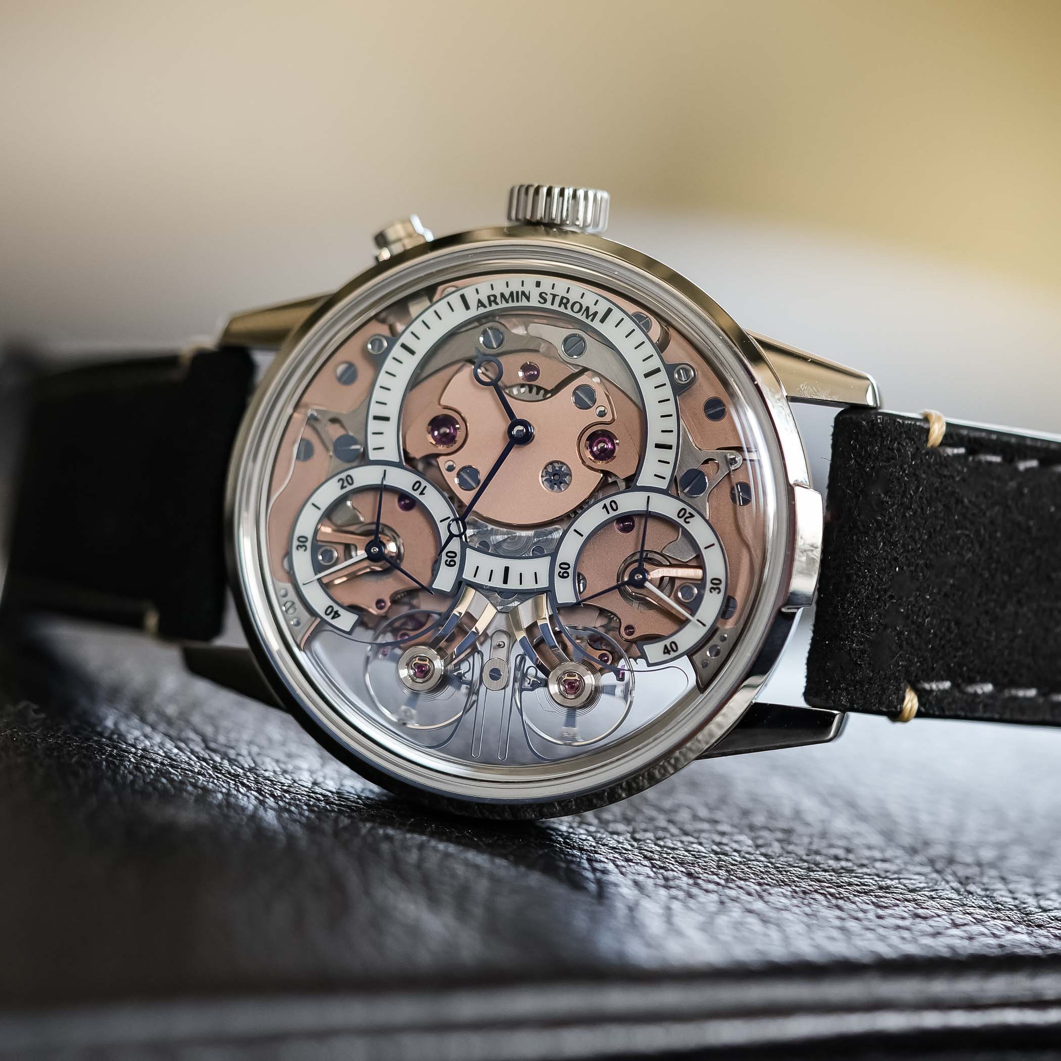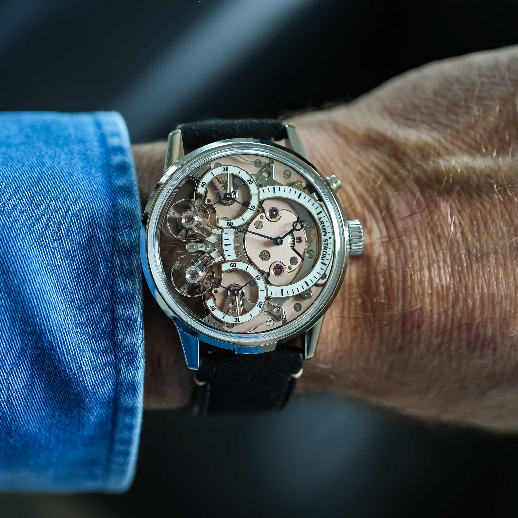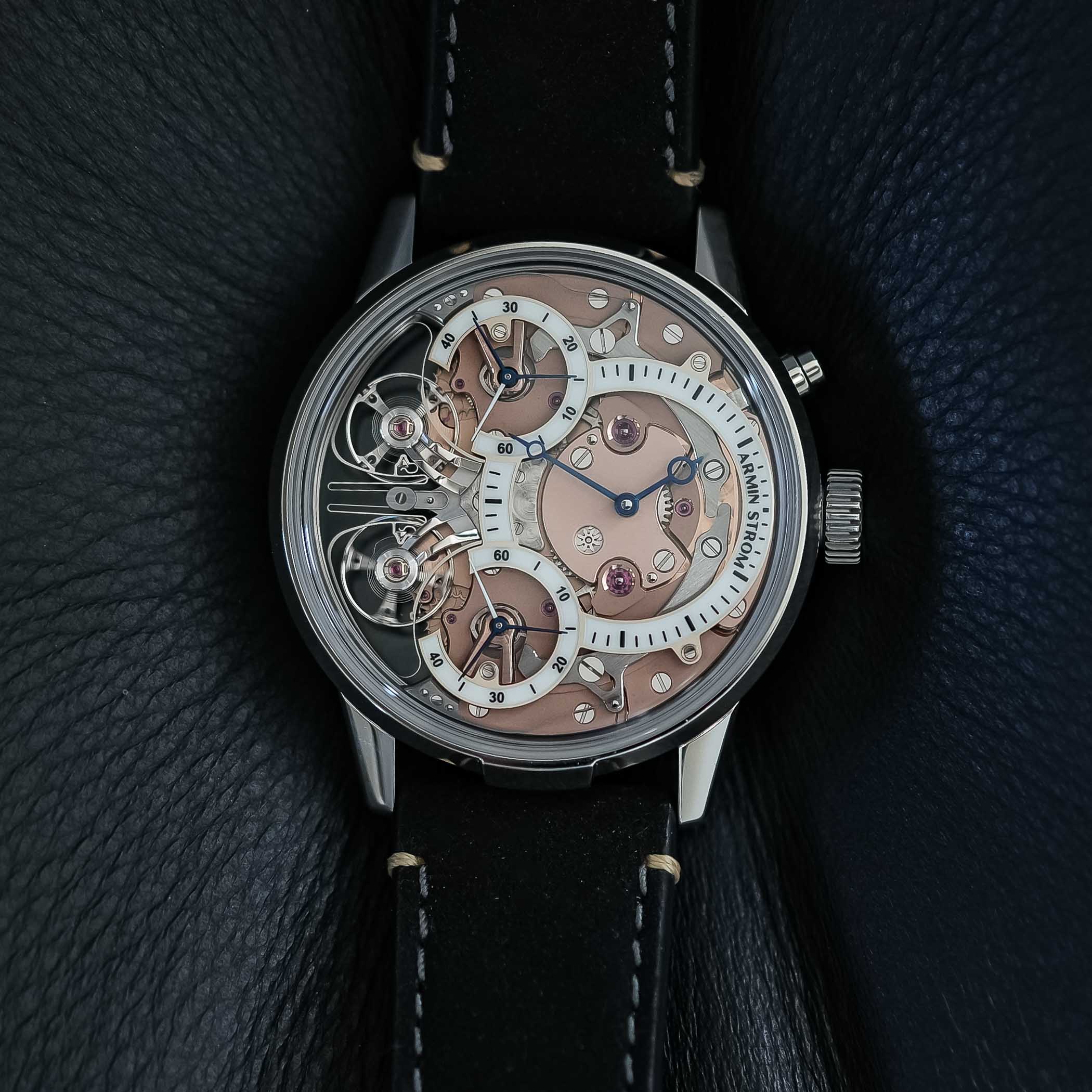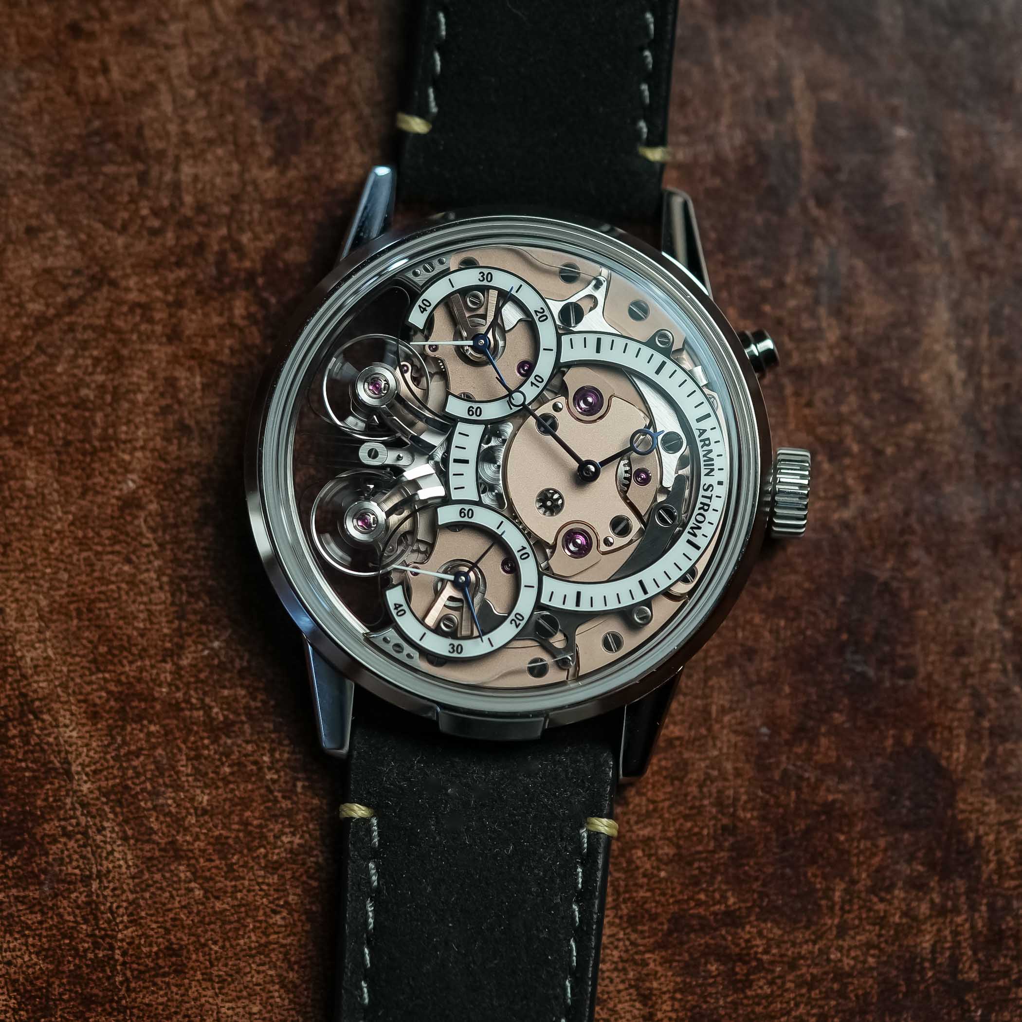 The two balance wheels are mounted on individual bridges, with the clutch spring swinging back and forth constantly. When the two run out of sync, it will show in the running seconds subdials. But a simple push of the button at 2′ will reset the two running seconds hands again. The movement itself runs at a rate of 25,200vph, which equates to 3.5Hz. Thanks to the two-barrel system, it delivers a power reserve of up to 80 hours. And, as we’ve come to expect from Armin Strom, everything is beautifully finished.