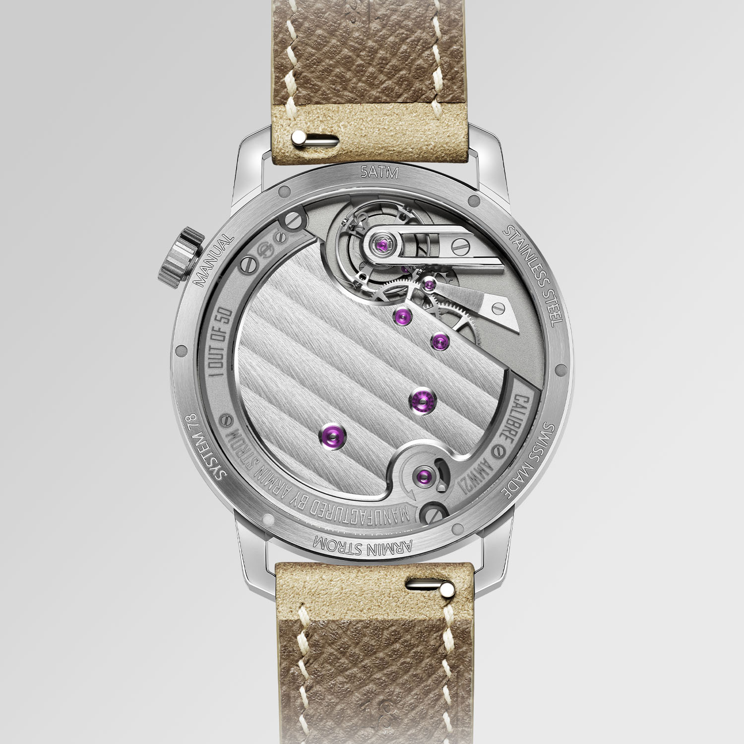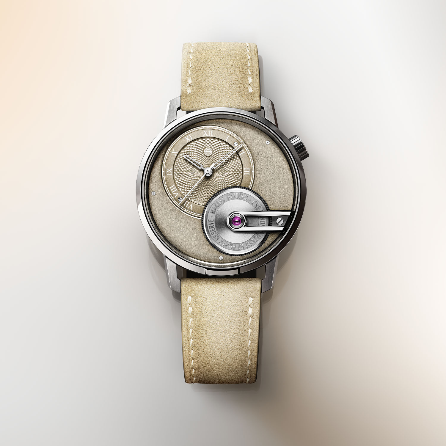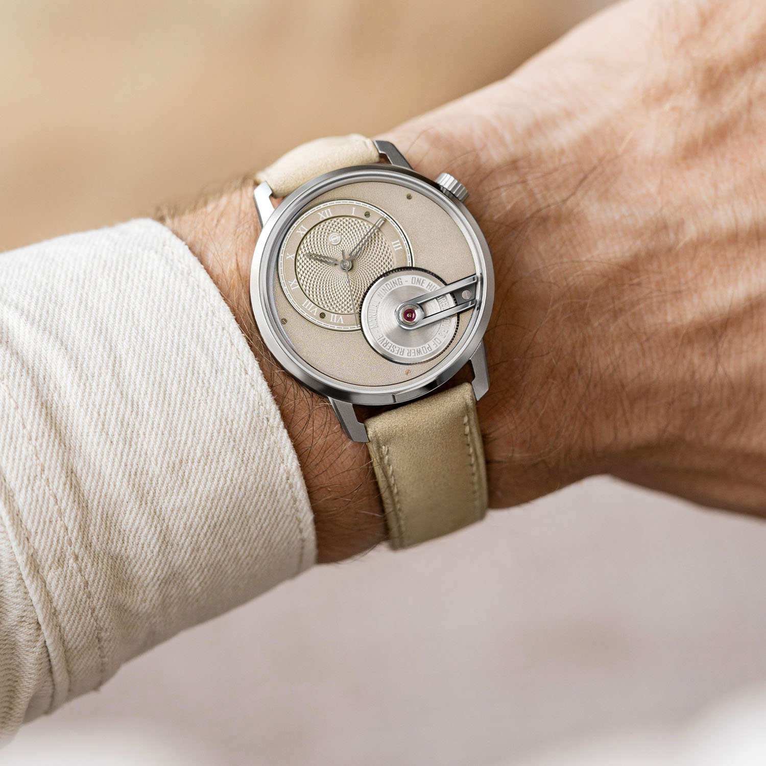 The Tribute 1 Sandstein honours Armin Strom’s hometown of Burgdorf in the canton of Bern, Switzerland. The native Burgdorf sandstone – long a symbol of strength, timelessness and a defining element of the region’s architecture – now inspires this refined interpretation of the Tribute 1. For that, Armin Strom brings a nice combination of monochromatic, warm tones to the watch and a subtle interplay of textures. The off-centred sand-toned dial is thus adorned with a grain d’orge guilloché pattern and Roman numerals, where time is read thanks to polished, rhodium-plated hands. This module takes place on a frosted background using the same warm, discreet sand colour, which is complemented by a sand-toned alcantara strap with white stitching.