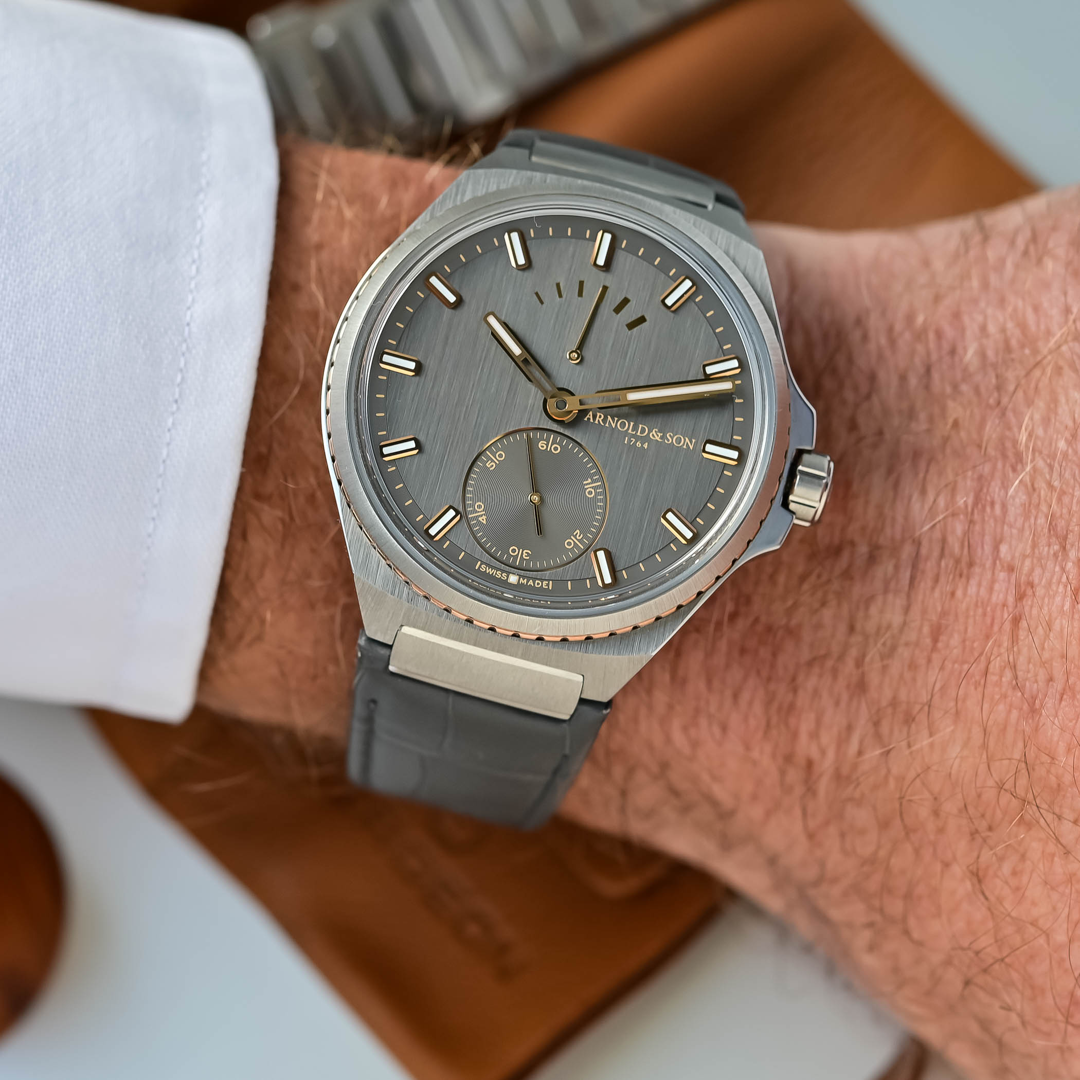 The dial has a vertically brushed satin finish in what Arnold & Son calls Lizard Point Grey, referencing the southern tip of Great Britain. A power reserve indicator sits at 12 o’clock with an arc of six cutouts that increase in size, while a recessed sub-dial at 6 o’clock has the small seconds. This vertical arrangement recalls the classic layout of early John Arnold marine chronometers. The applied golden indices and open-worked hour and minute hands have Super-LumiNova inserts, while the outer minute track shares the texture of the sub-dial’s snailed pattern.