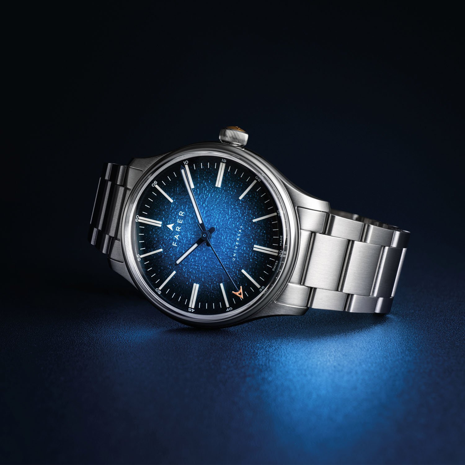 Named after the Edward Bonaventure vessel, the first English ship to reach Russia in the 16th century, leading to diplomatic contacts between Elizabeth I and Ivan the Terrible, the Venture features a gradient blue dial with a crackled texture. The long, slim white baton indices are made from Lumicast, a blend of ceramic and Super-LumiNova. The glossy blue pencil hands are also luminescent, and the blue central seconds hand has a peach-coloured Farer ‘A’ at its tip.