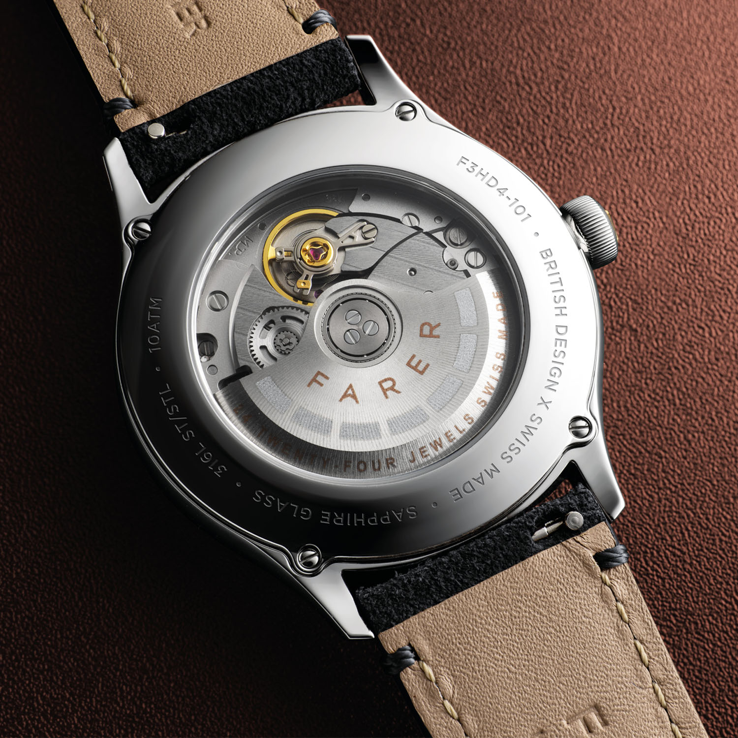 Powered by a soignée-grade (top-grade) La Joux-Perret G101 automatic movement with a robust 68-hour power reserve, it features a customised rotor etched with the Farer logo and a stop-seconds mechanism.