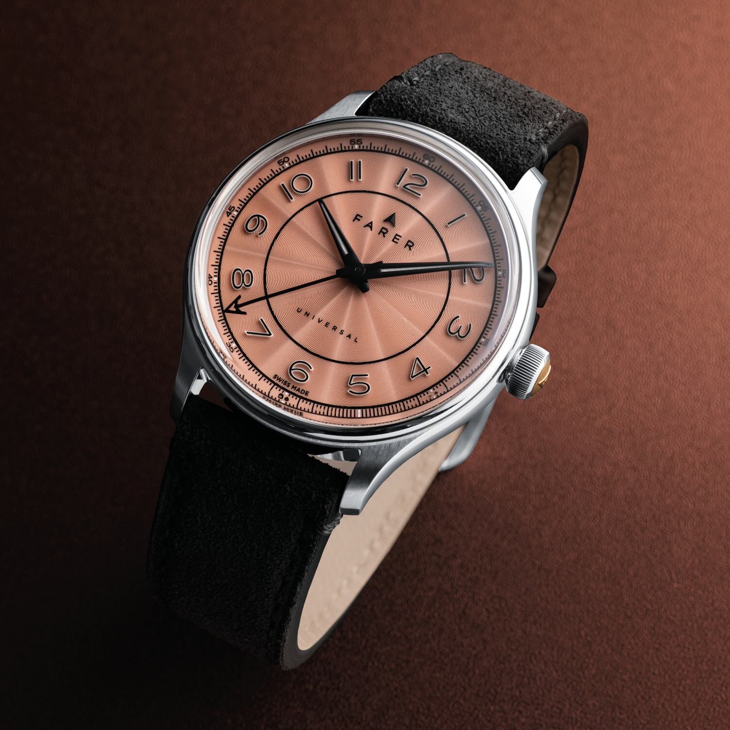 Bearing the name of the SY Aurora, a steam yacht that served as an Antarctic expedition vessel from 1911 to 1917, the Aurora features a mesmerising copper dial with a flinqué guilloché-style pattern. The applied Arabic numerals are also made from Lumicast and surrounded by a detailed black minutes track and a black ring framing the centre of the dial. The glossy black tapered hands are filled with X2 Super-LumiNova, and the black seconds hand has a Farer ‘A’ at its tip.