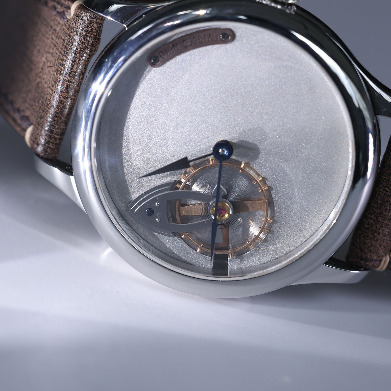 The dial is equally discreet and clean, with a white copper base dial with a frosted finish and a pair of discreet hands in blued steel indicating only the hours and minutes. This almost empty display is only distracted by the presence of one of the two balance wheels, held in place by GuoBiao’s signature multi-layered arrow-shaped balance cock, made of steel and visible in most of the man’s creations. A screwed plaque is positioned on the other side with the maker’s name.