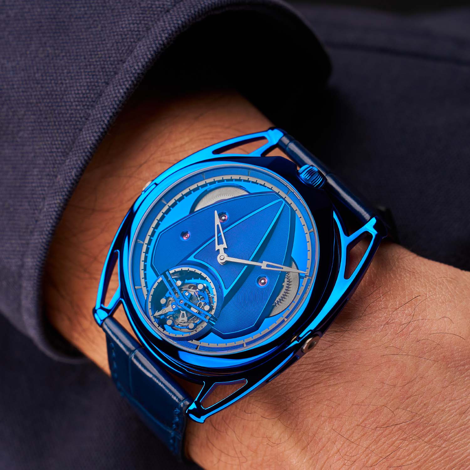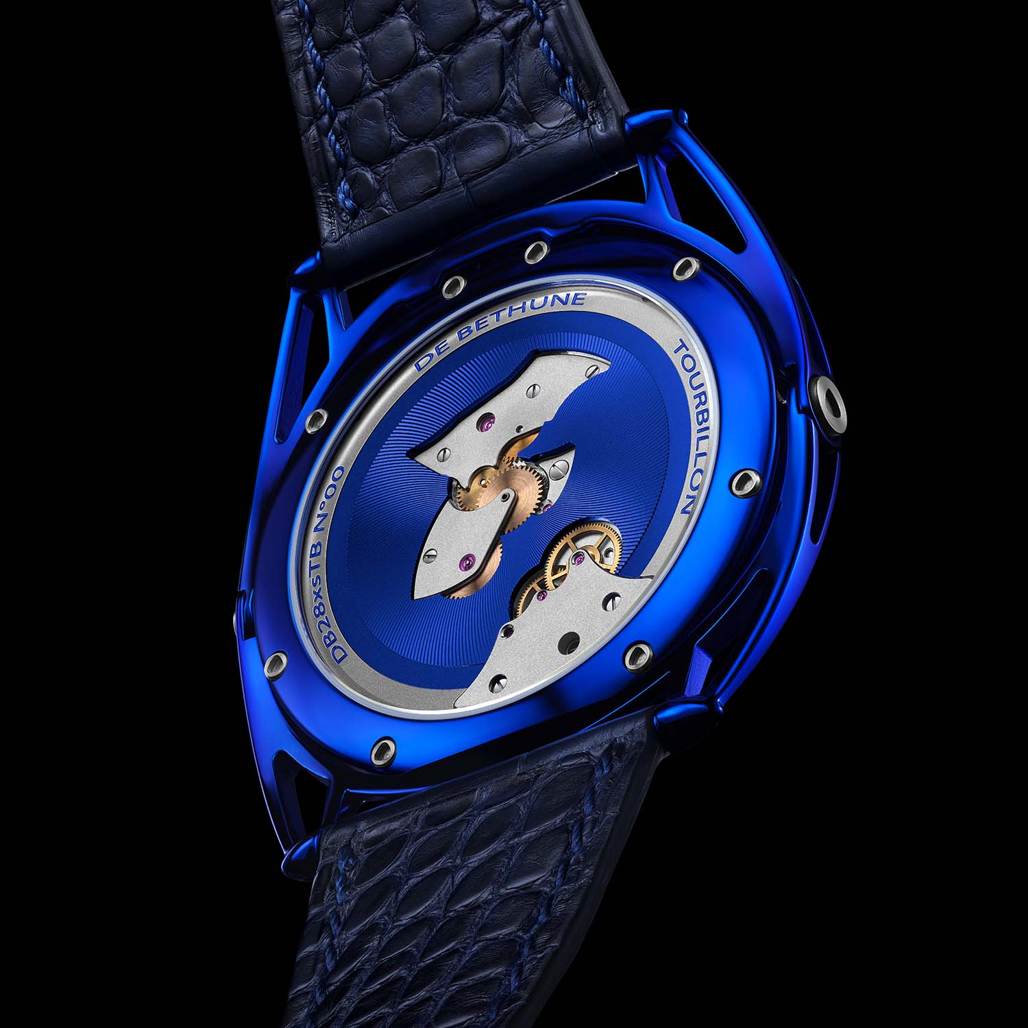 The new DB28xs Kind of Blue Tourbillon is crafted from grade 5 titanium; the case is mirror-polished before undergoing the brand´s proprietary thermal oxidation, resulting in a vibrant and enduring blue tone. The restrained 8mm thickness underscores the ergonomic achievement, with the patented floating lugs adapting naturally to the wrist. Sapphire crystals with double anti-reflective treatment front and back ensure a clear view of both the architecture and mechanics within.