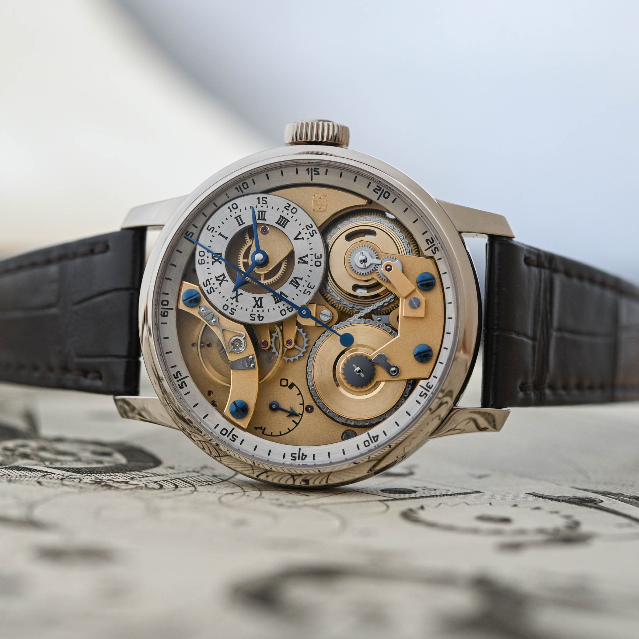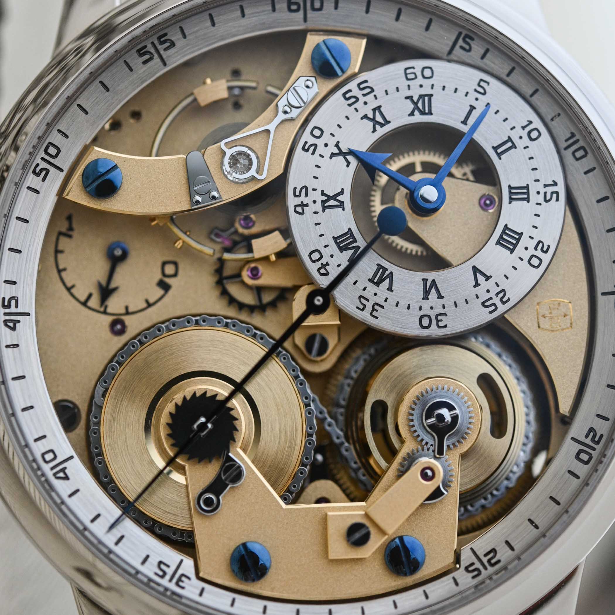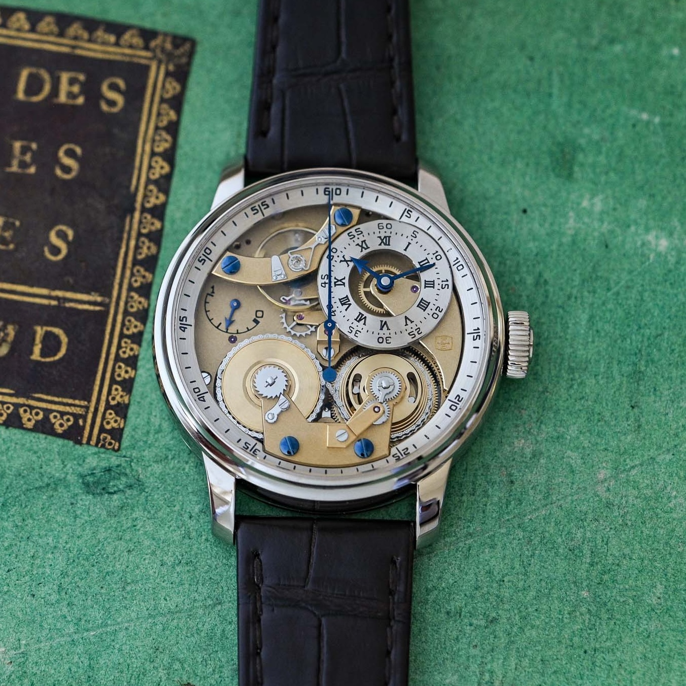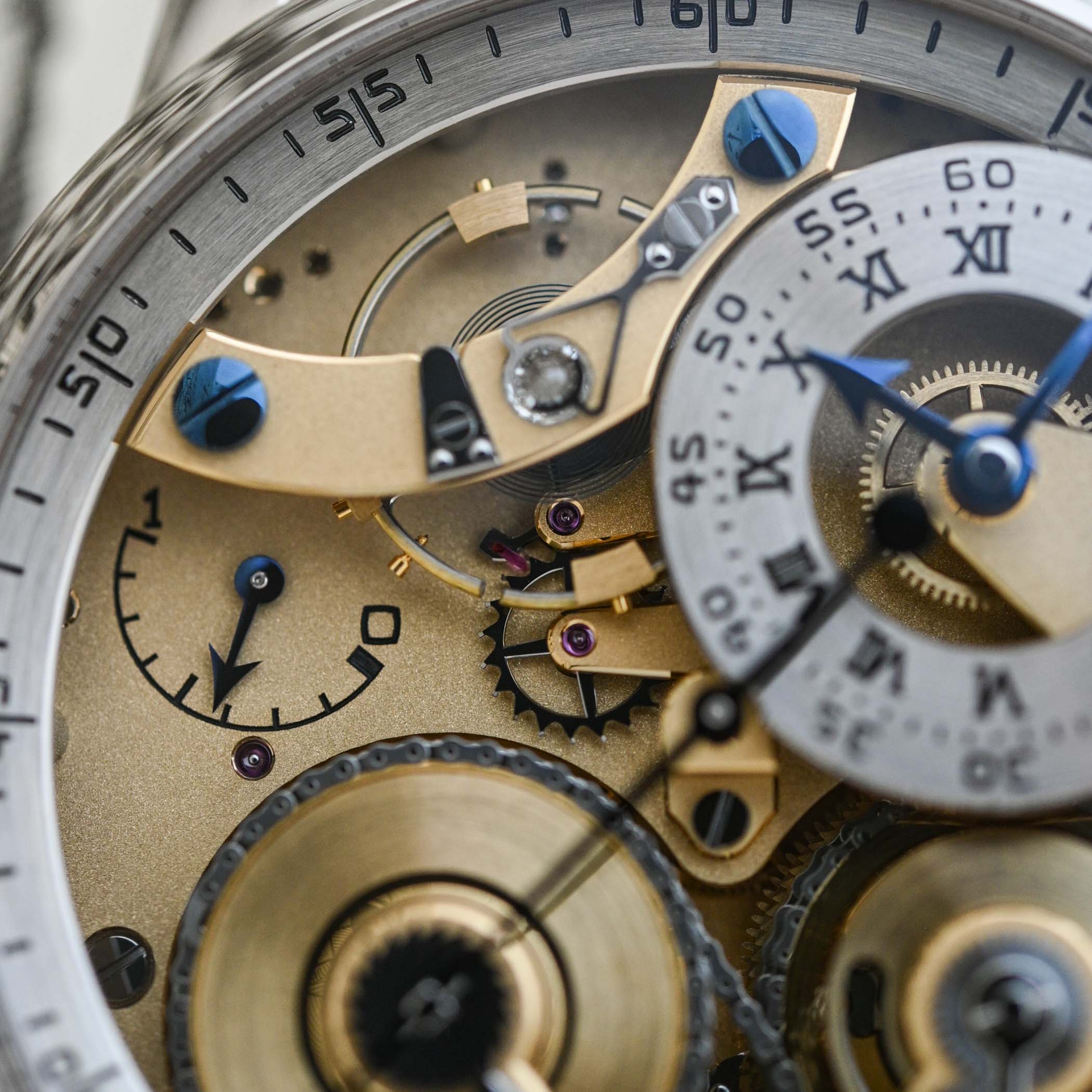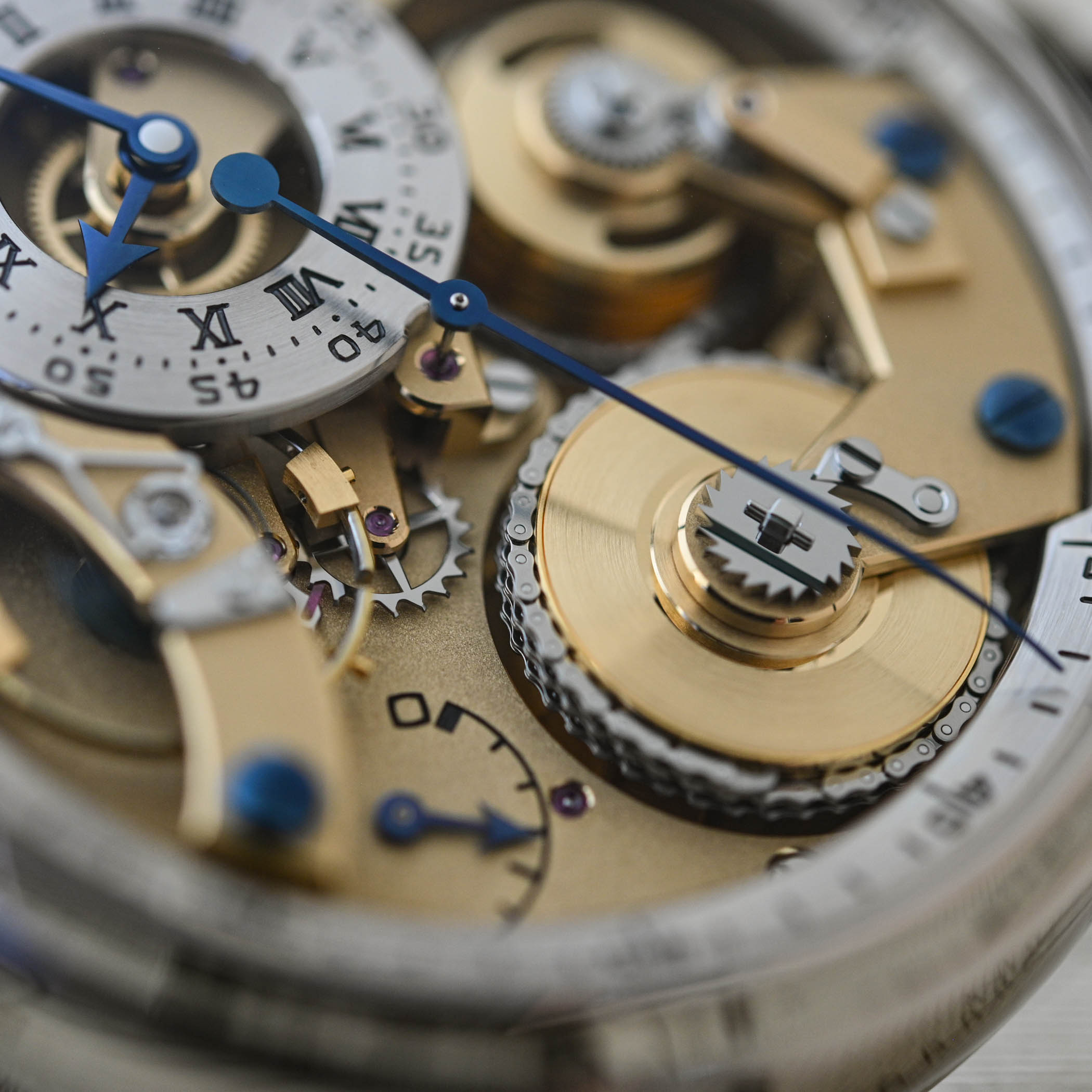 In pure Berthoud fashion, all the structure of the movement, with its stepped bridges and pillars, is entirely visible. The focus on chronometry is also evident, with a constant-force mechanism (fusée-and-chain), a bimetallic Guillaume-type thermo-compensated split balance, a stop-seconds mechanism, and more.