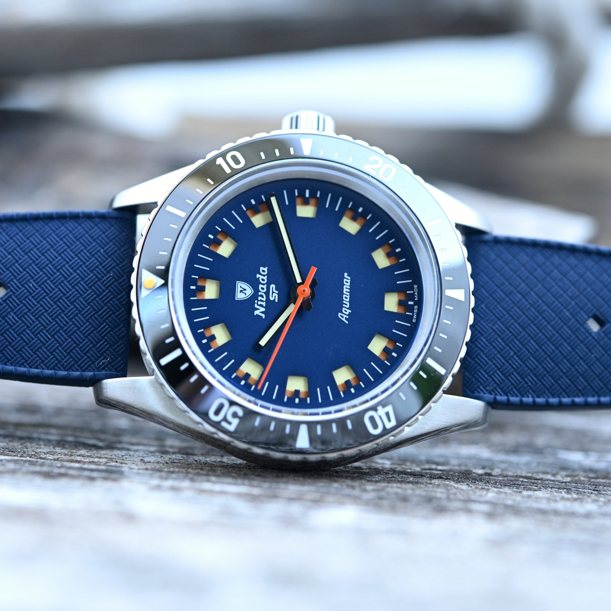 Since its revival in 2020, Nivada Grenchen has been something of a secret among collectors of vintage dive watches, with reeditions of some of its cult tool watches produced between 1950 and 1970 at accessible prices. Founded in 1926, Nivada Grenchen produced its first automatic and waterproof watch, the Antarctic, in 1950. Put to the test in extreme conditions by members of the U.S. Navy during the Deep Freeze 1 expedition to the South Pole from 1955 to 1956, like Rolex and Tudor, the brand promoted its watches with testimonials printed in newspapers. With a rich archive, Nivada recently revived the Aquamar, a lesser-known dive watch from the 1960s, presented in a compact case with a surprising twist.