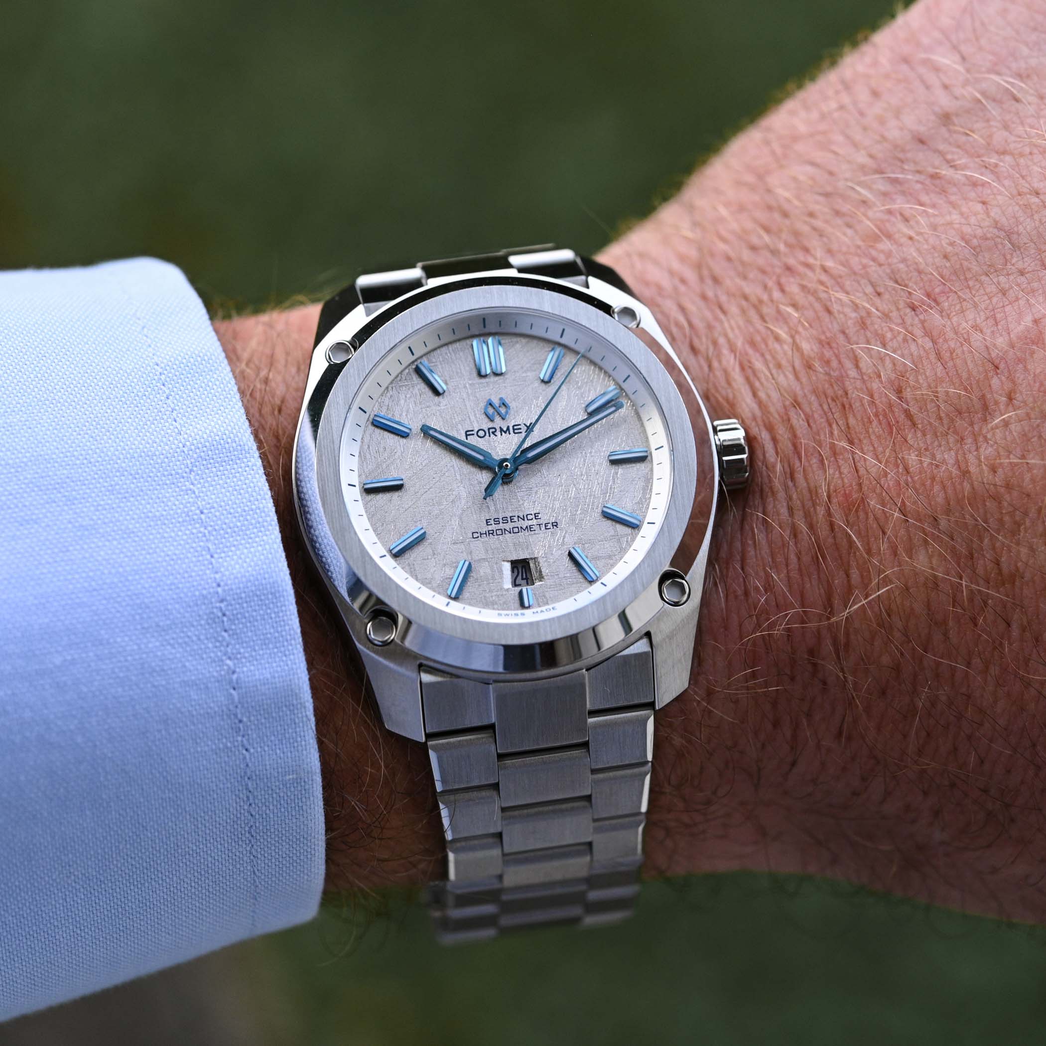 Formex’s Essence line, introduced in 2018, quickly earned respect as the brand’s versatile, go-anywhere sports watch, combining sharp case architecture, great engineering, and chronometer-certified accuracy. In 2020, the collection took on a cosmic turn with the debut of the Space Rock editions, featuring dials cut from the ancient Muonionalusta meteorite. Over time, these rare cosmic surfaces appeared in variations, from the ice-blue Space Glacier to the salmon-hued Space Gold achieved through rose gold electroplating. For its 25th anniversary, Formex expands the line with the Essence Space Ghost 41mm, a model that introduces a new case size positioned between the existing 39mm and 43mm formats, as well as updates regarding its daily practicality.