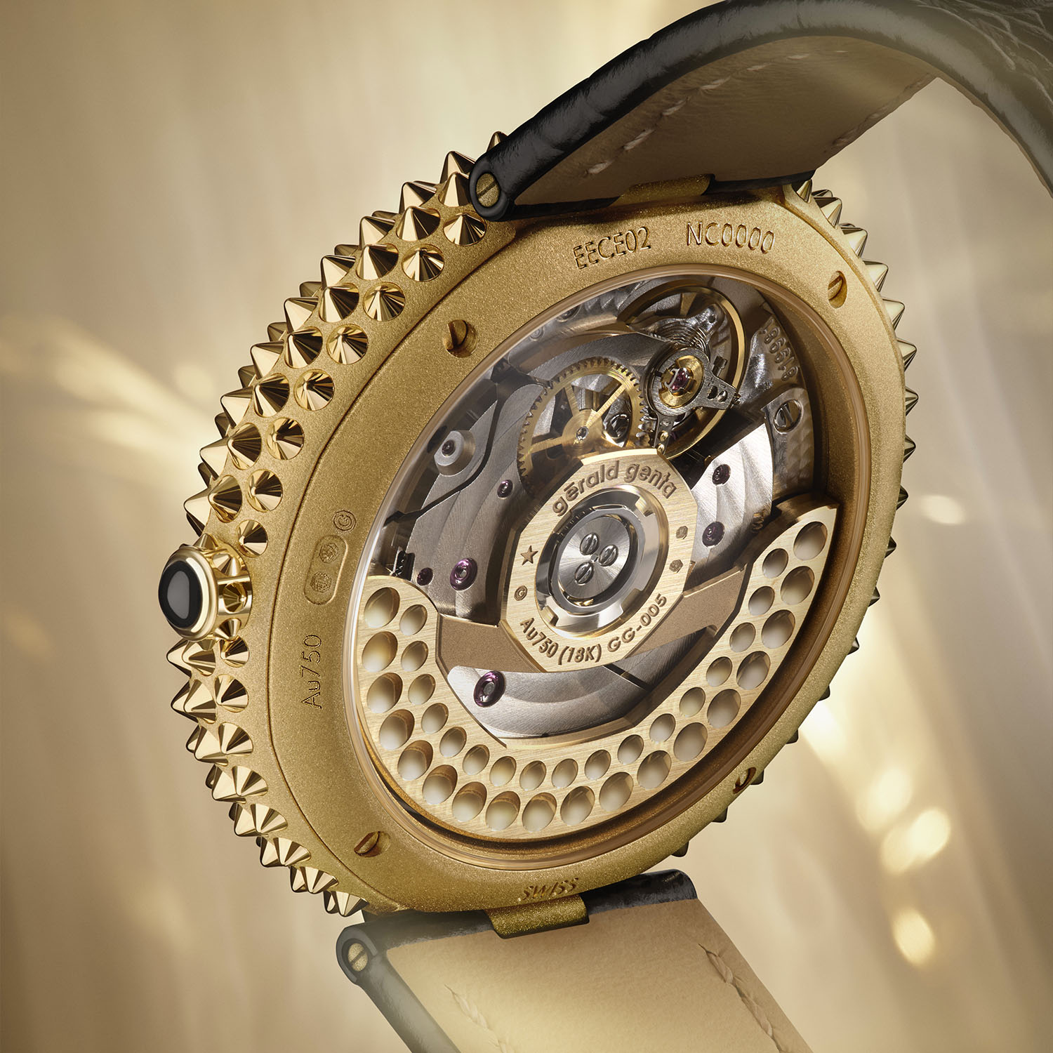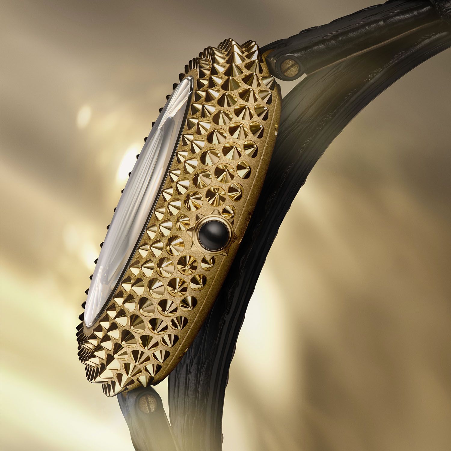 Recreating the rounded shell of a sea urchin, the yellow gold case of the Black Onyx model has a doughnut-shaped bezel. The glass-blasted matte base contrasts with the 223 hand-screwed yellow gold spikes, which are polished and taper in size as they reach the dial. Even the crown, with its black onyx insert, has polished spikes. The sleek black onyx dial has 12 gold spiked hour markers and a matte black minutes track with 5-minute markers. As a designer who favoured octagonal elements, the dial is protected by a faceted sapphire crystal with eight planes. The edgy, punky vibe of the watch continues to the black leather Bund-style strap.