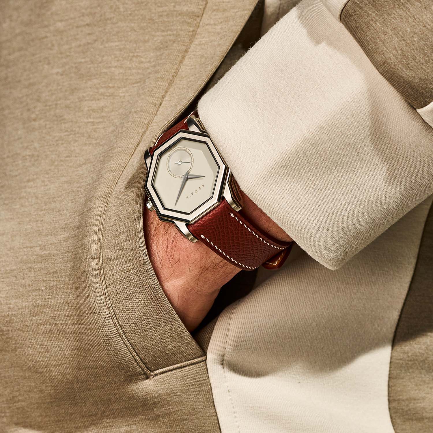 The quartz Angles owed much of its appeal to its ultra-slim profile, and Sohaib Maghnam, Beda’a’s CEO and designer, insisted that the Mecaline preserve that. After 15 months of fine adjustments, the result is a 37mm x 34mm stainless steel case with a thickness of just 6mm, only 0.7mm thicker than its quartz predecessor. The proportions are essentially unchanged, maintaining the same clean lines and unisex appeal that made the collection popular. The crown has been re-engineered for comfort and grip.