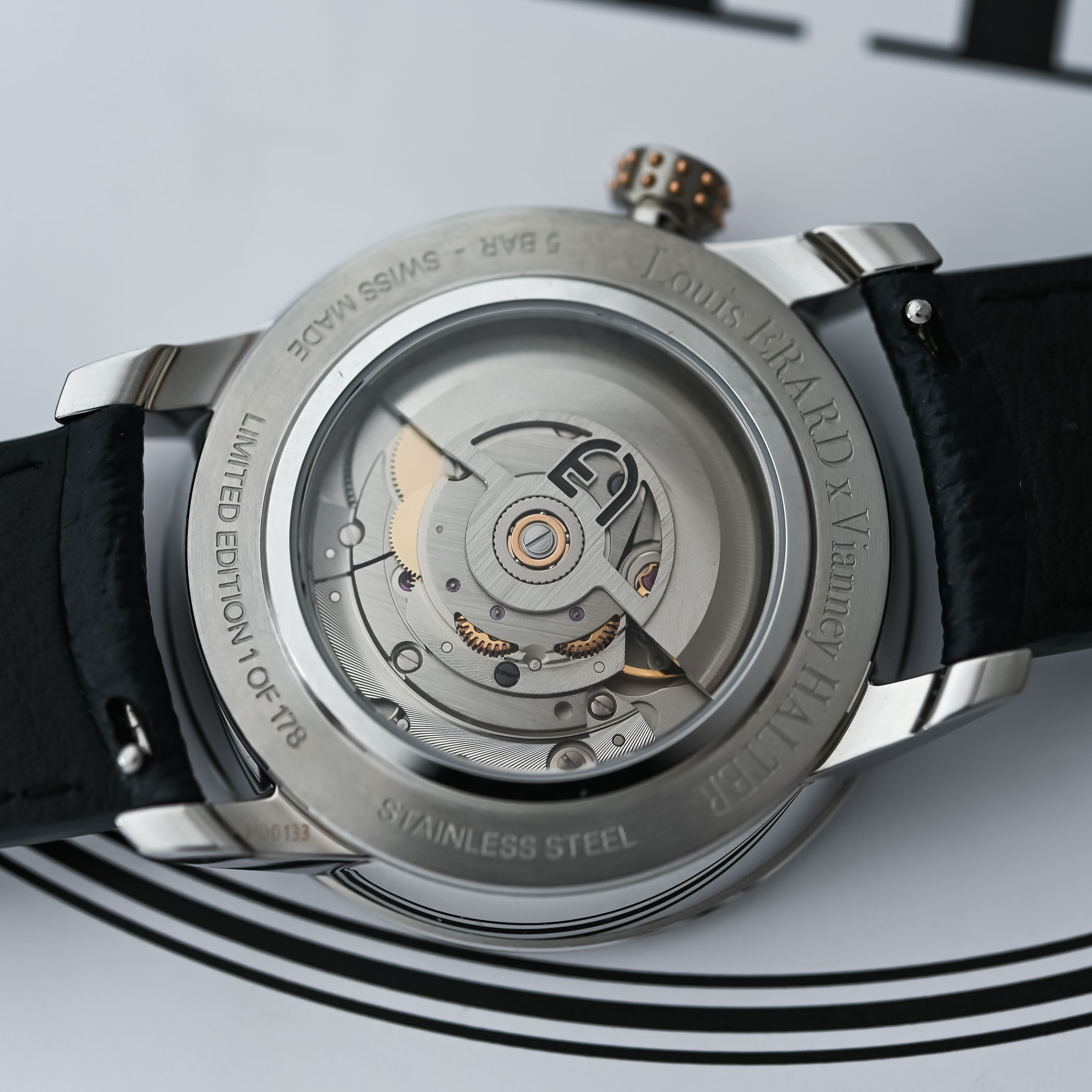 The series is powered by the automatic Sellita SW266-1, the same reliable calibre used in previous editions. It operates at 28,800 vibrations/hour, offers 38 hours of autonomy, and is decorated with an openworked oscillating weight bearing Louis Erard’s black lacquer symbol.