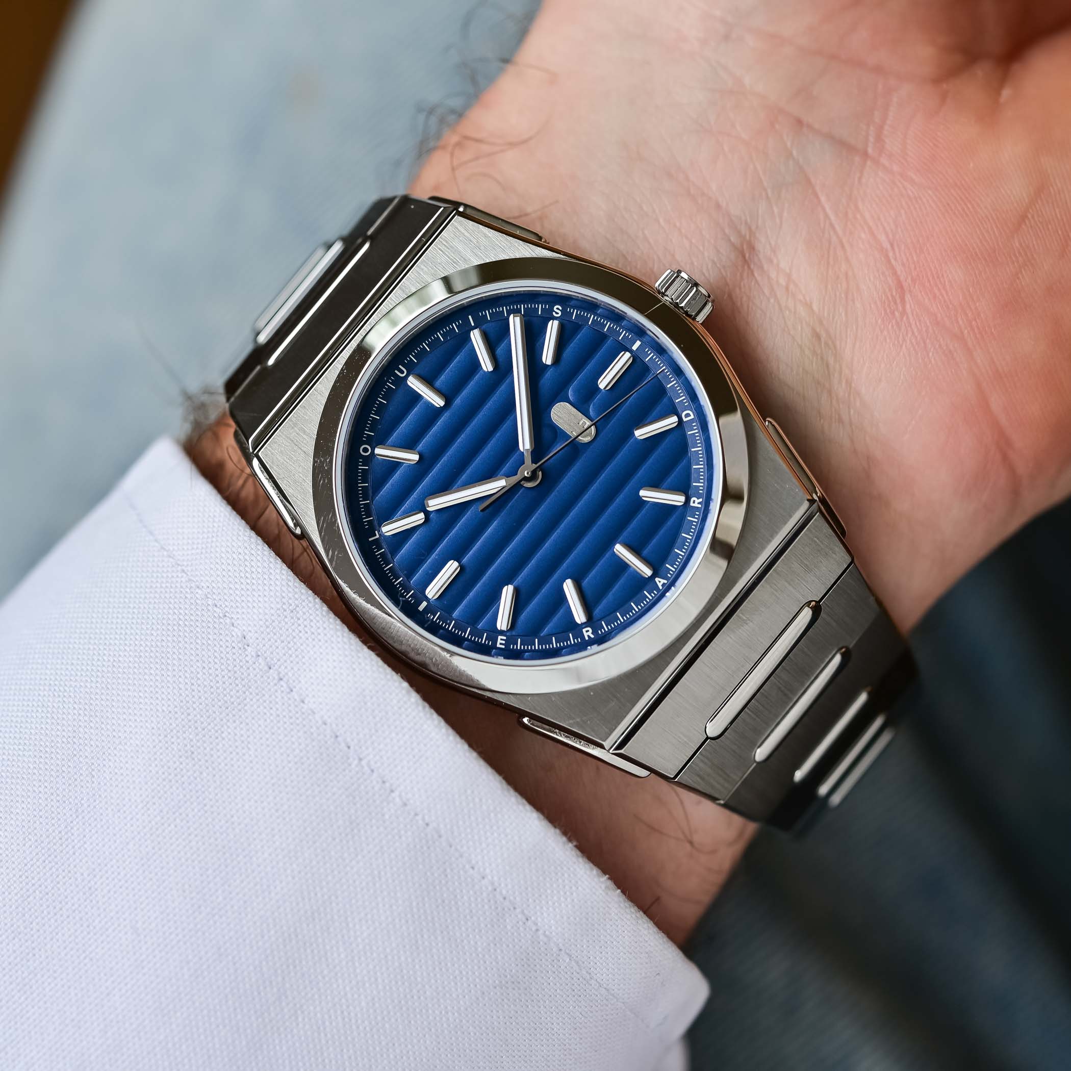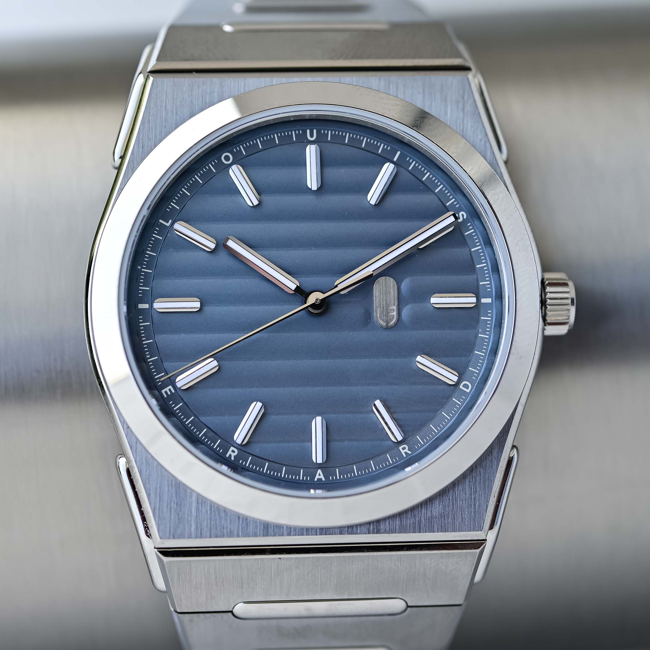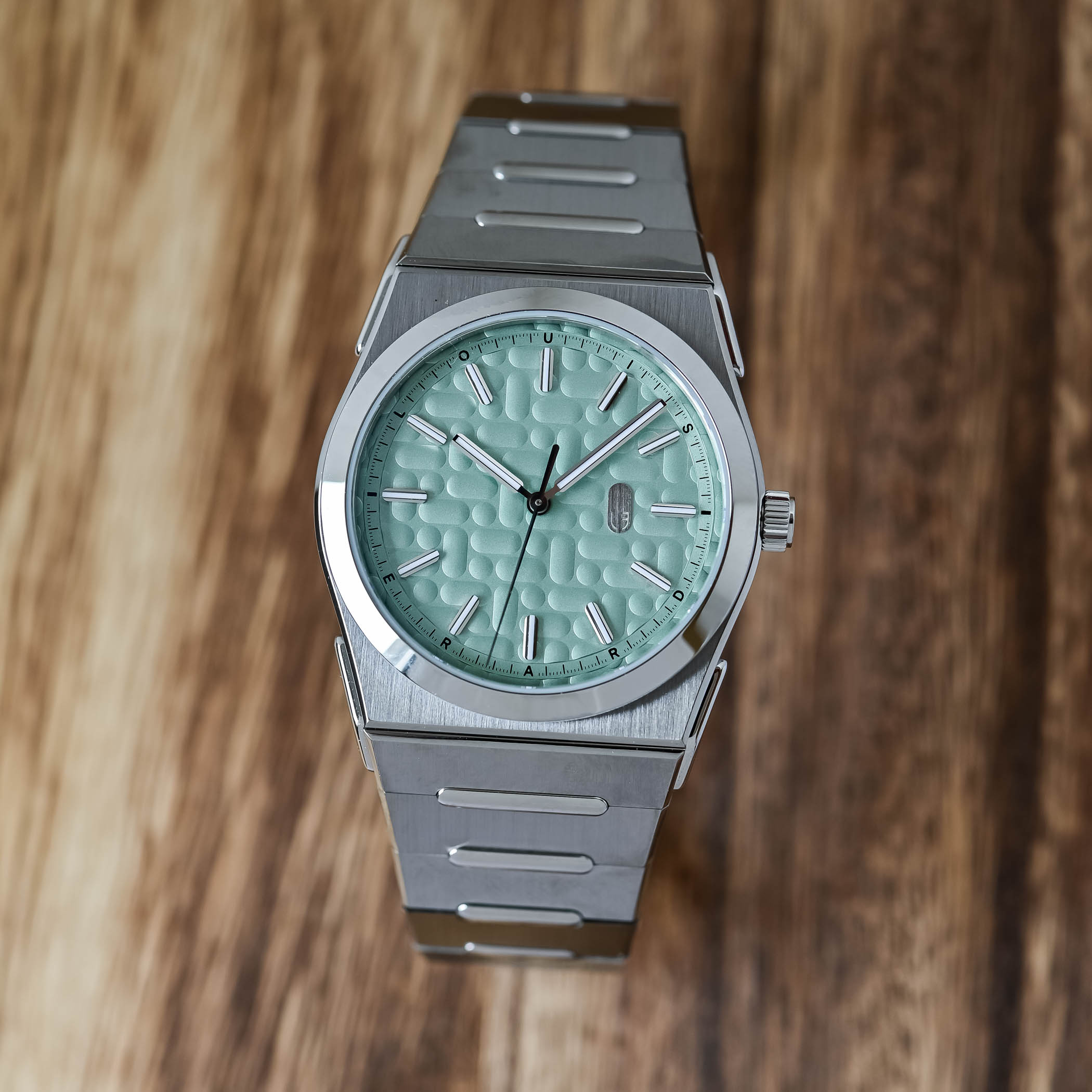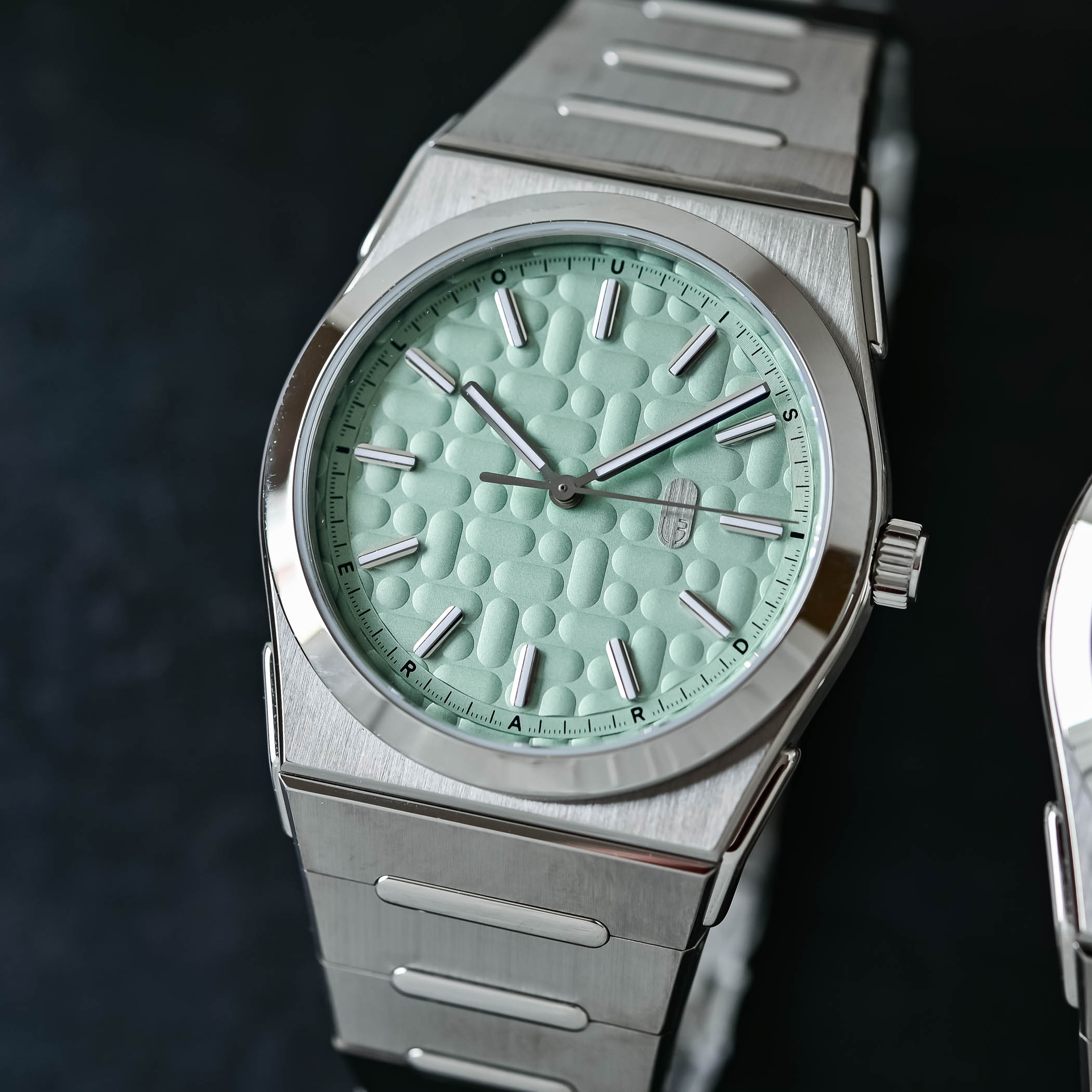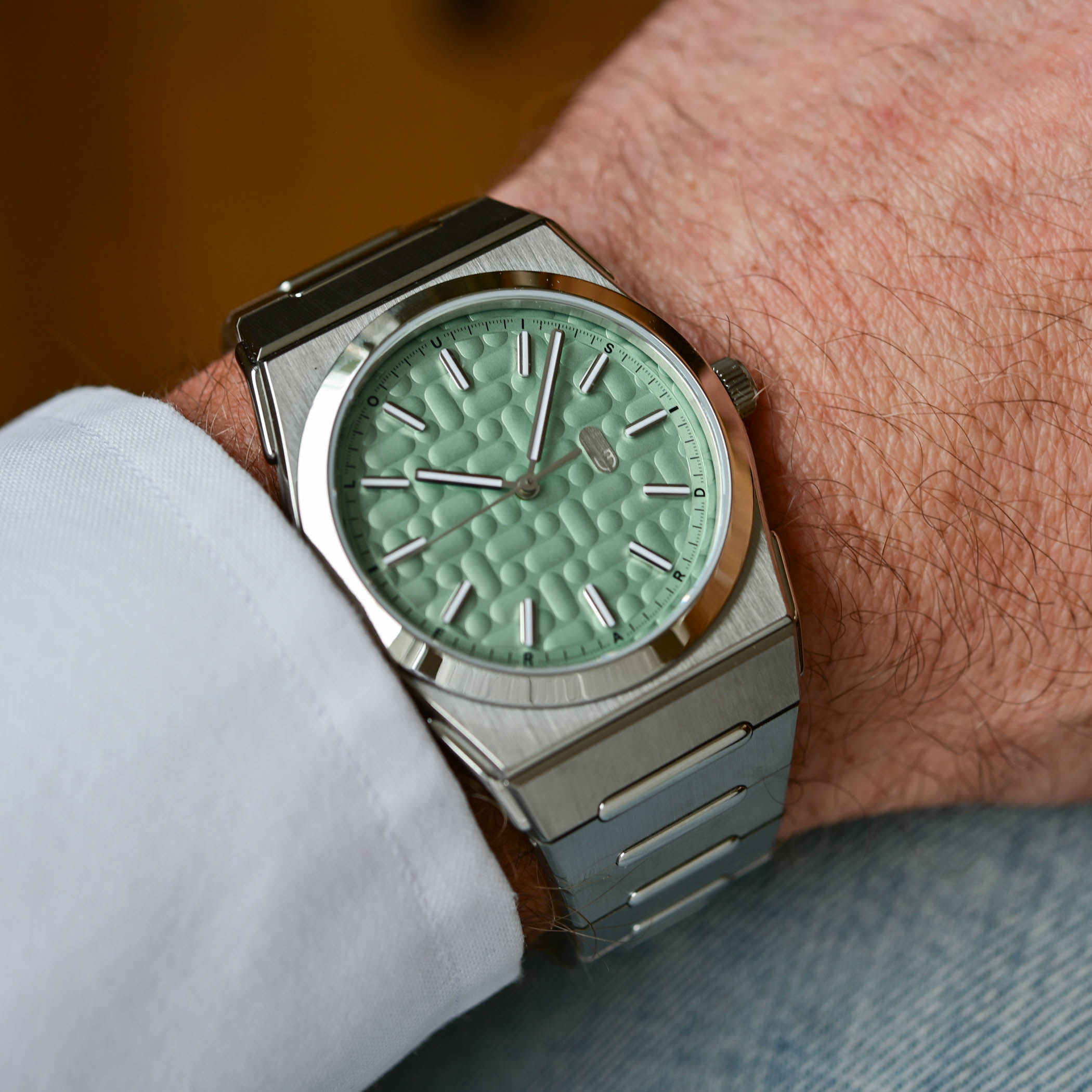 The textured dials come in three colours, Mint Green, Slate Blue and Deep Blue. The Mint Green dial caught our eye with its groovy pattern of raised oblongs, echoing the middle links of the bracelet. The blue dials, on the other hand, feature wide horizontal gadroons. The diamond-cut hour markers and baton hands feature rounded tips to match the oblong link and are treated with blue-emission Super-LumiNova. A feature that will please many is the absence of a date window. Another fun touch is the minutes track, which replaces numerals with the letters of Louis Erard.