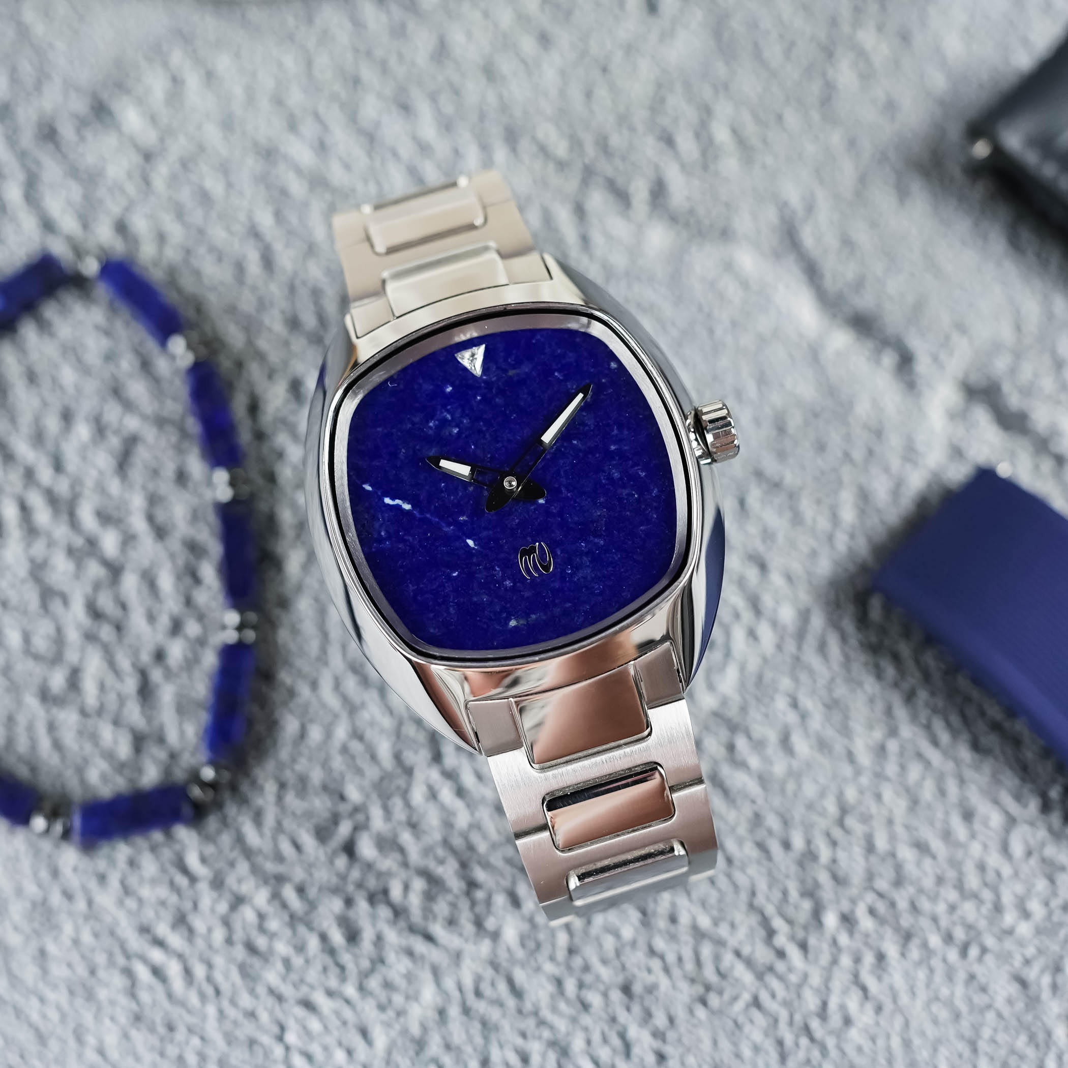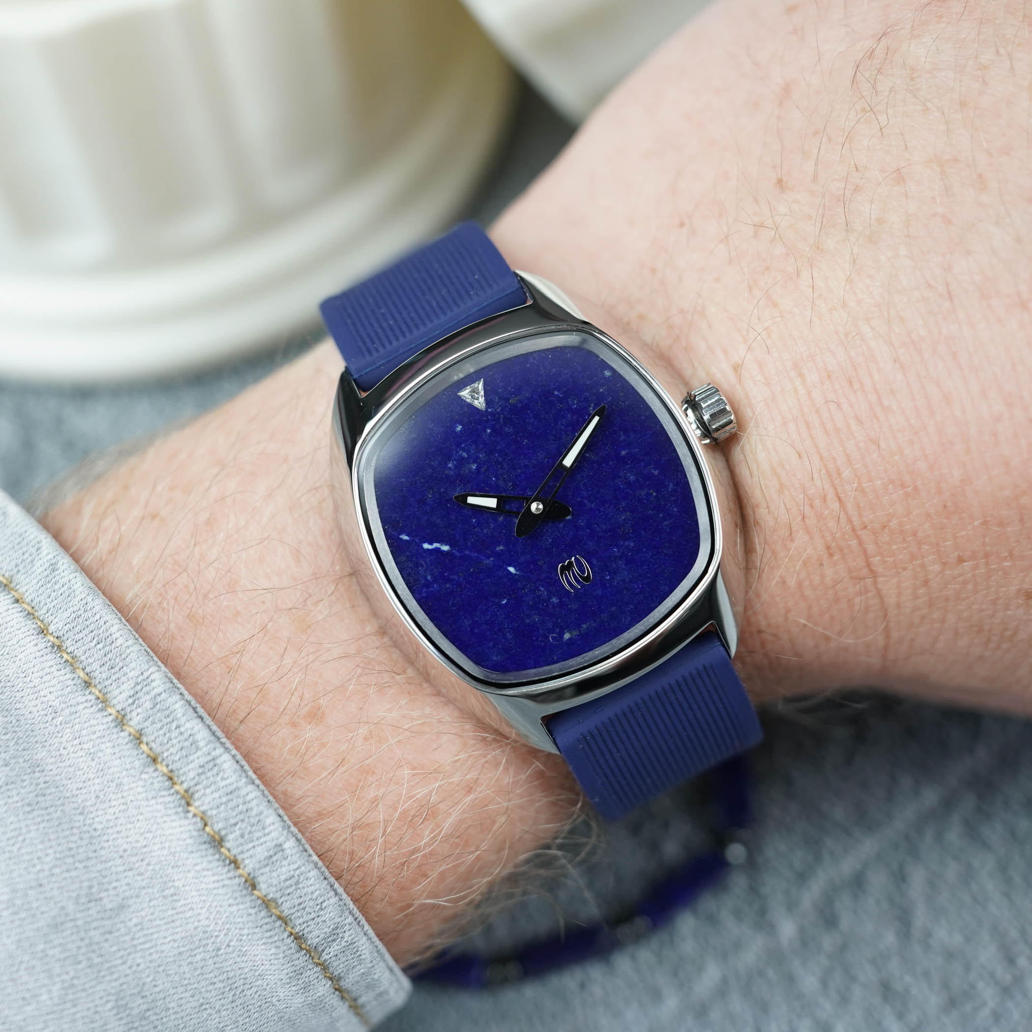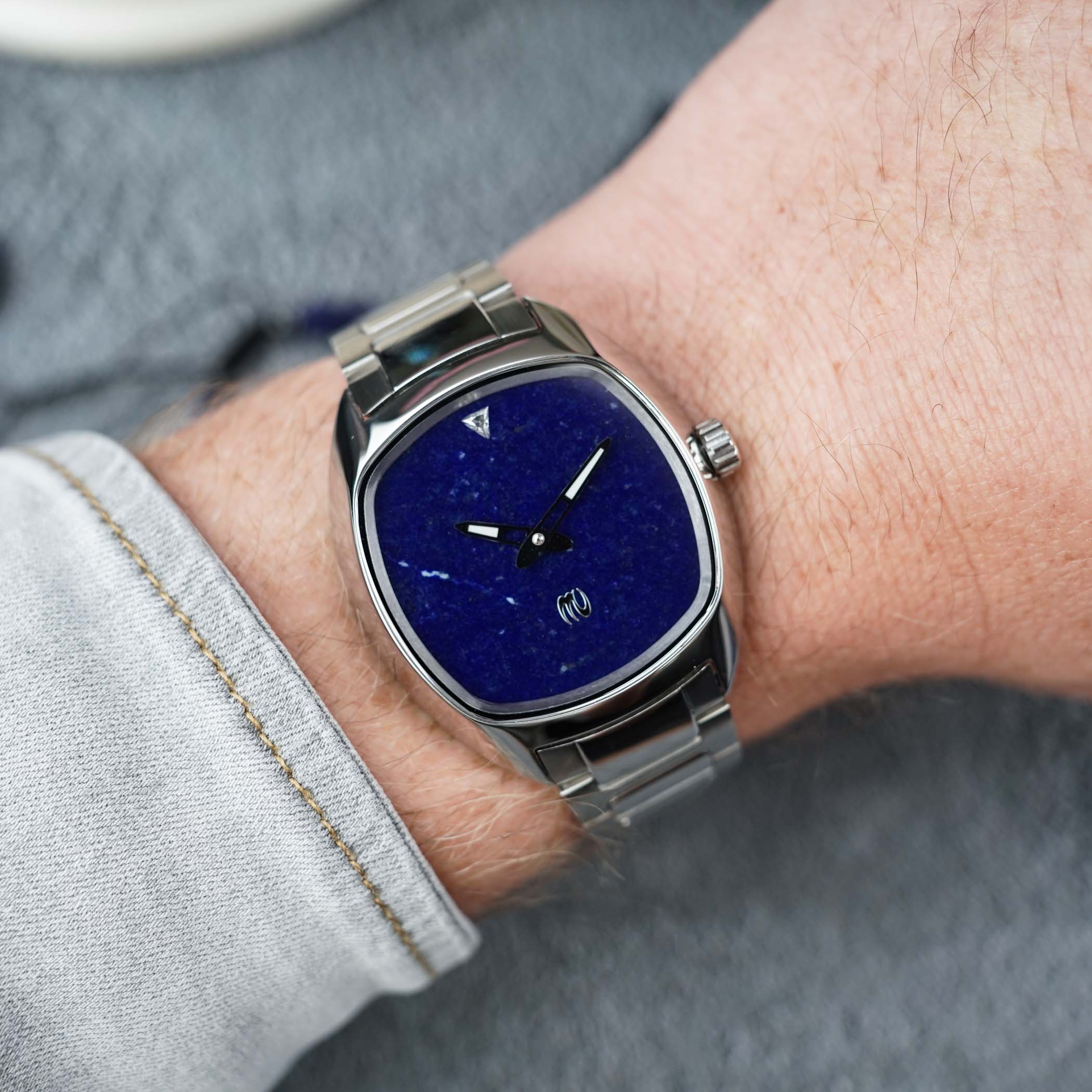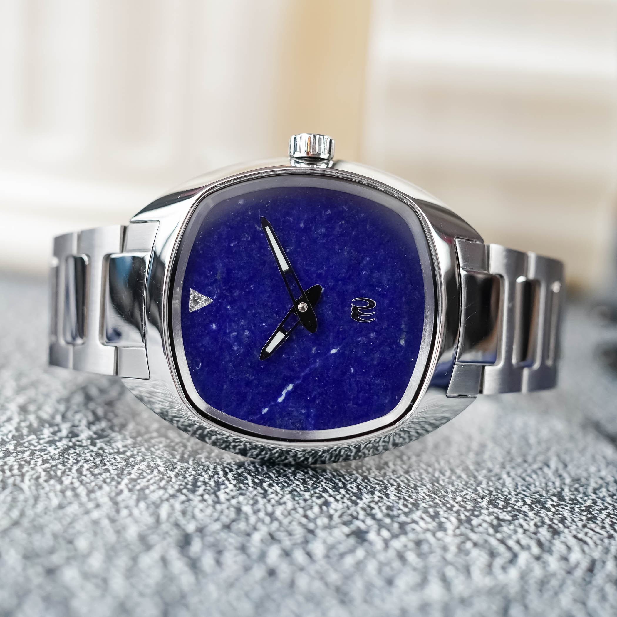 A unique case, brilliant blue lapis lazuli dial and tiny diamond highlight the latest piece from the young Greek brand.