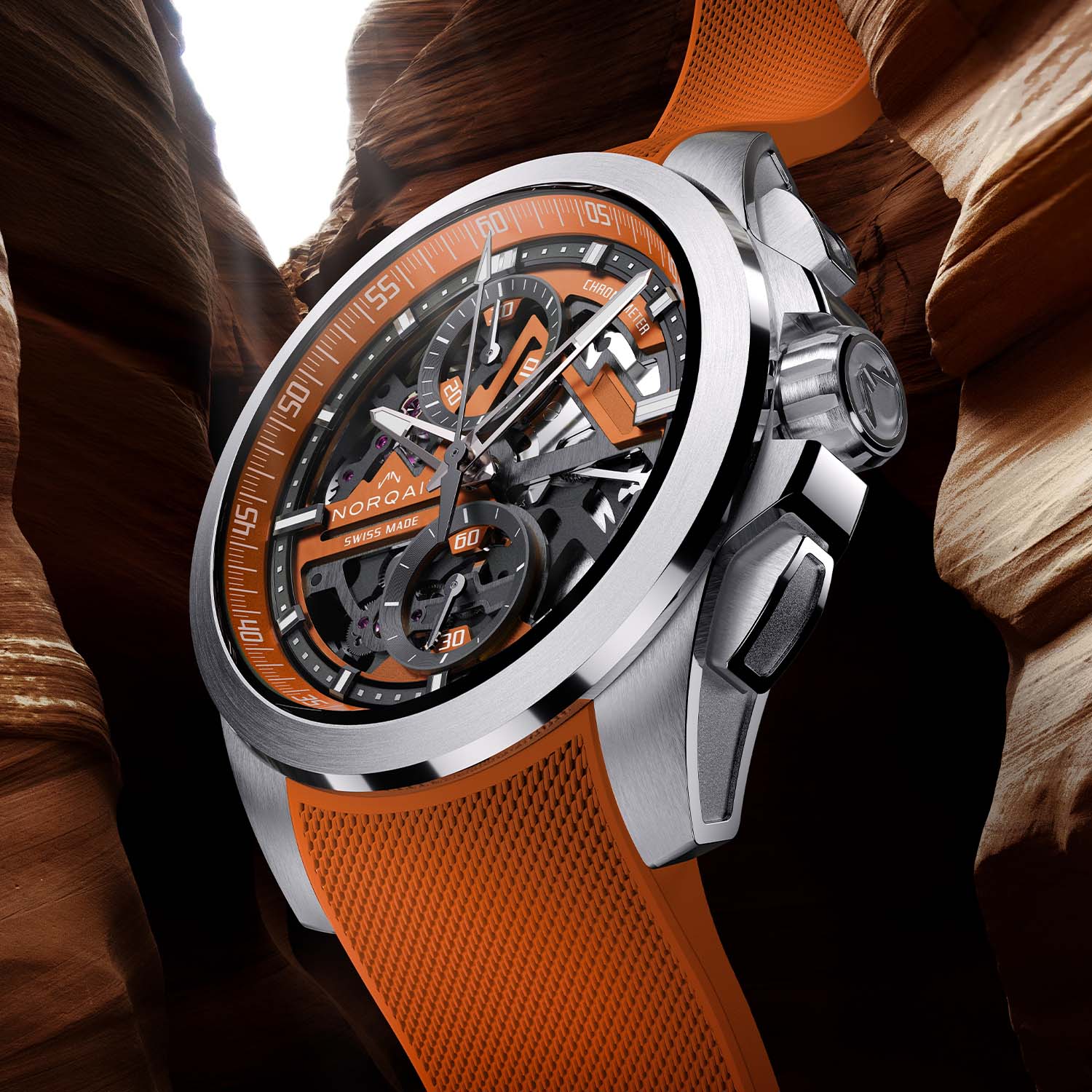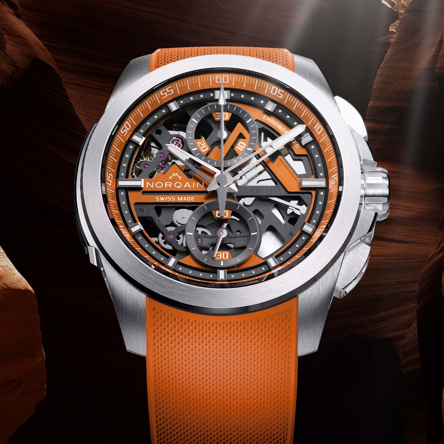 A zesty orange version of Norqain’s skeletonised flyback chronograph.