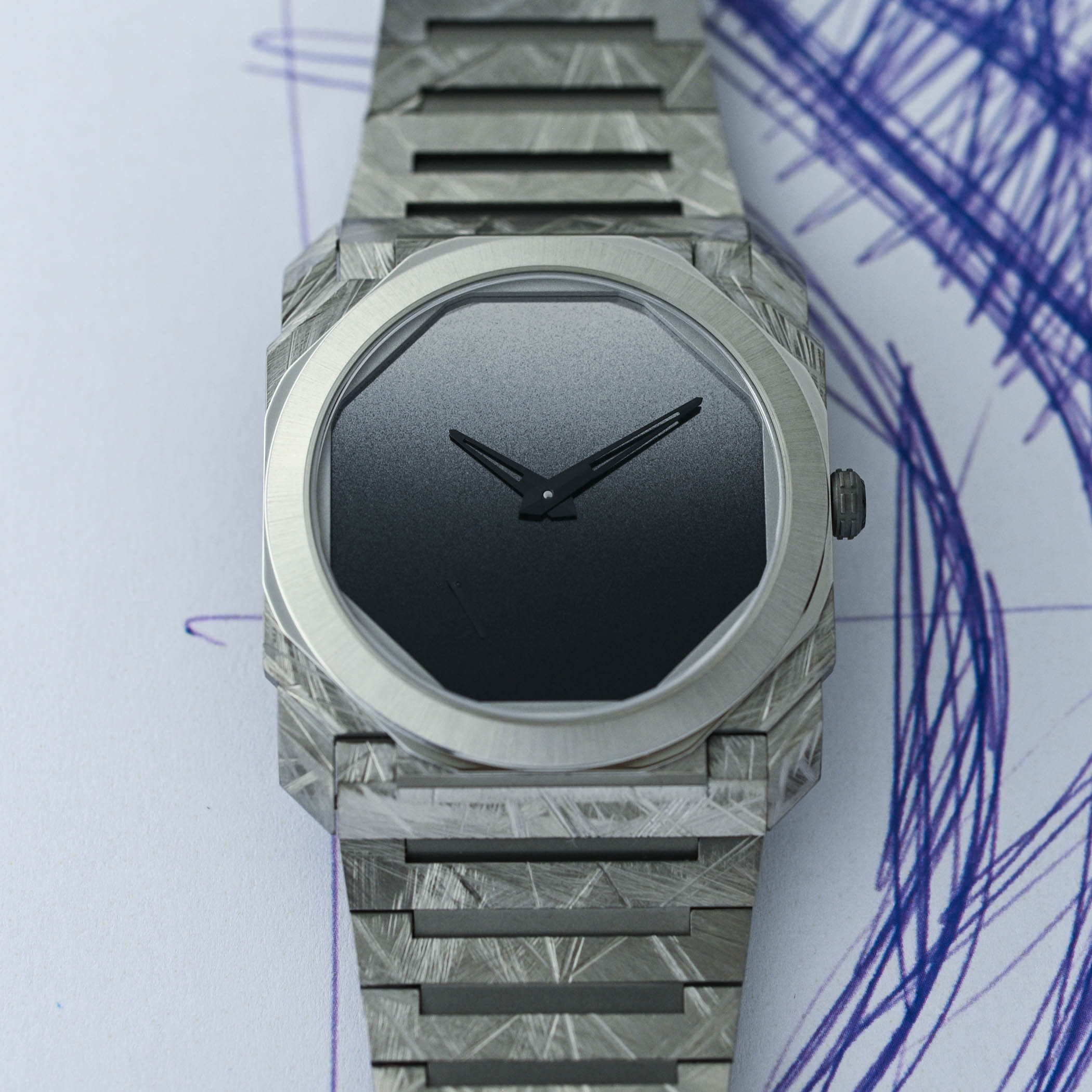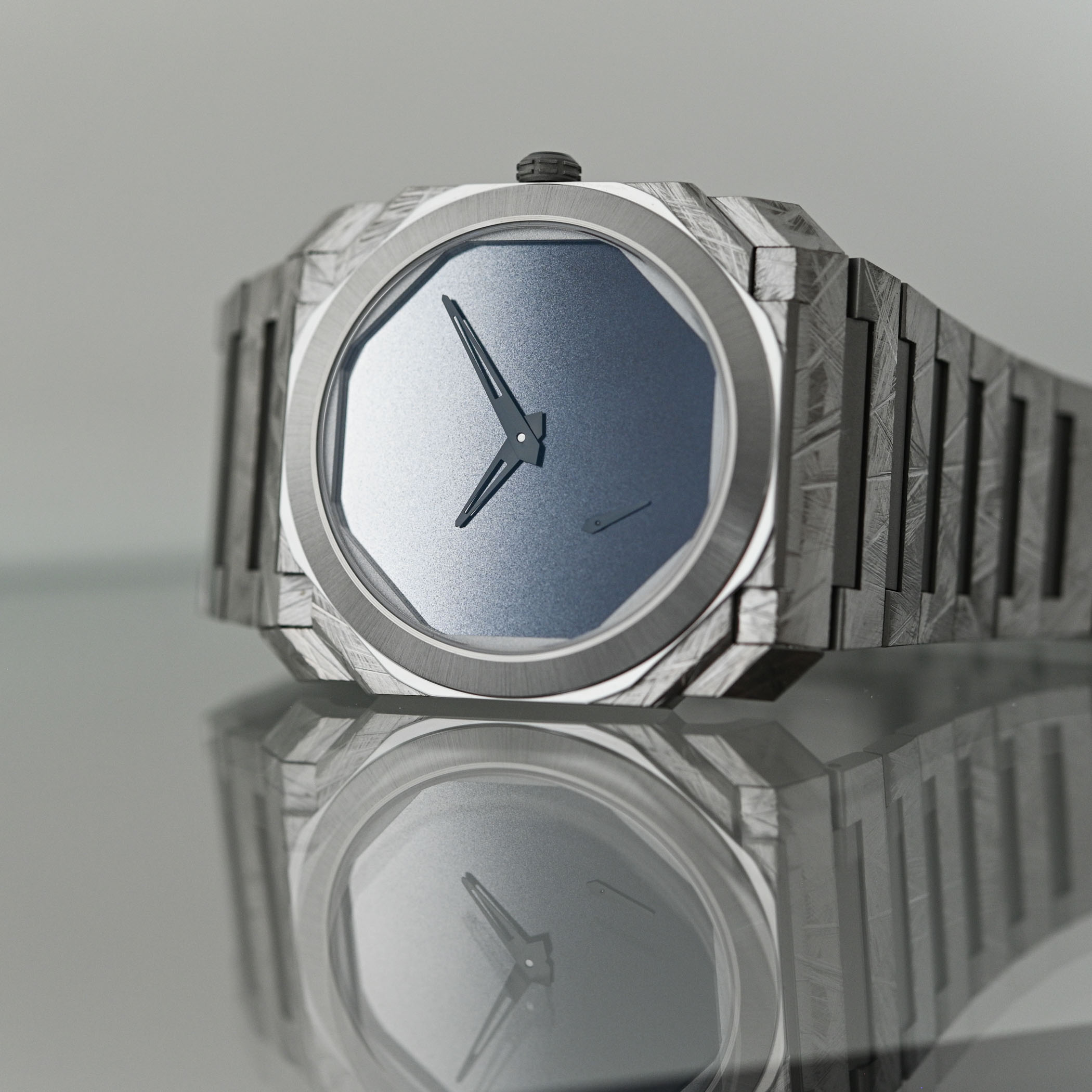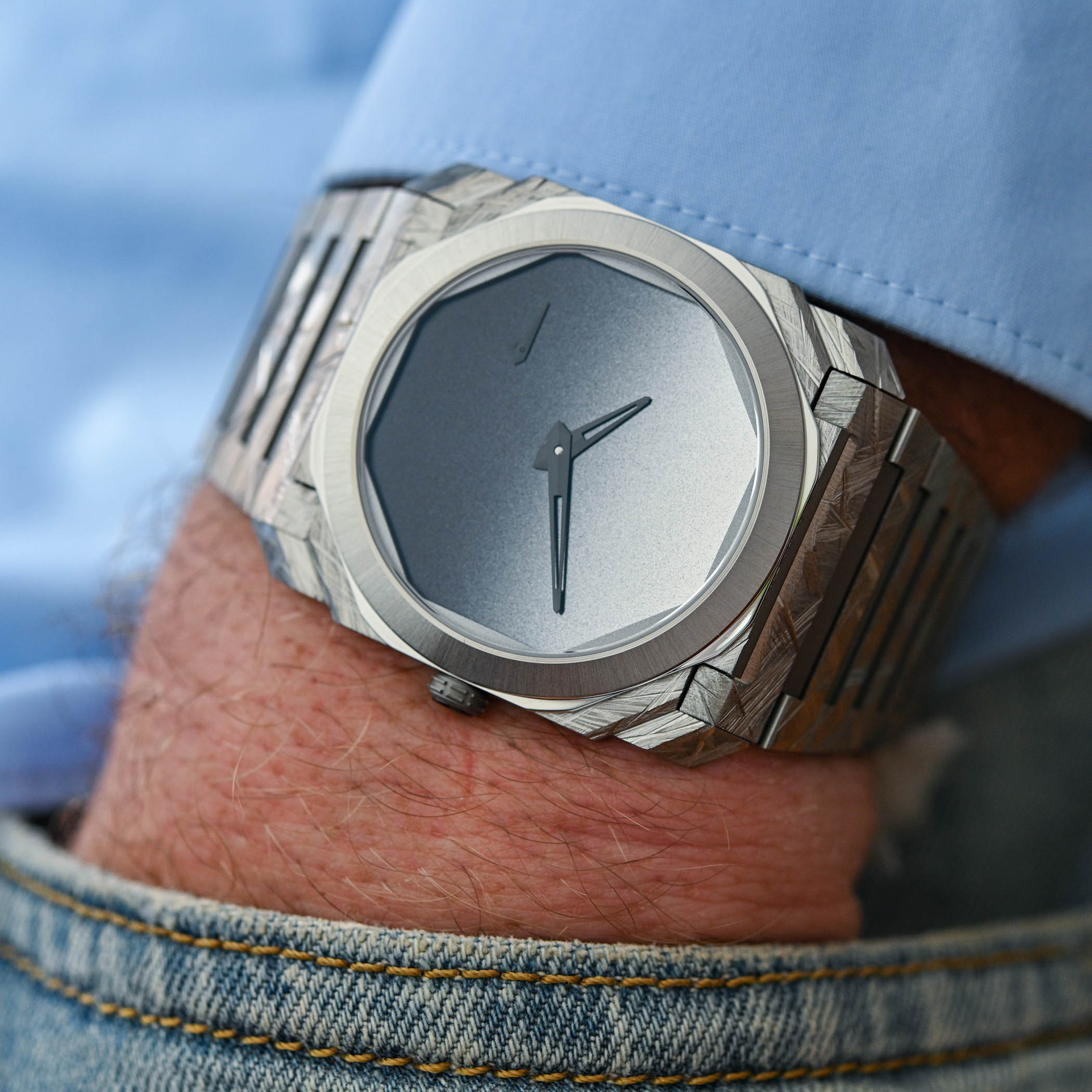 The 40mm titanium case with its ultra-slim profile of just 5.15mm and the integrated titanium bracelet are filed by hand to create a series of raw, crisscrossing patterns – similar to those you might find on a meteorite dial. Instead of muting the complex architecture of the stacked octagonal architecture, the patterns draw light and cast shadows on the facets, emphasising the powerful geometry of Buonamassa’s design.