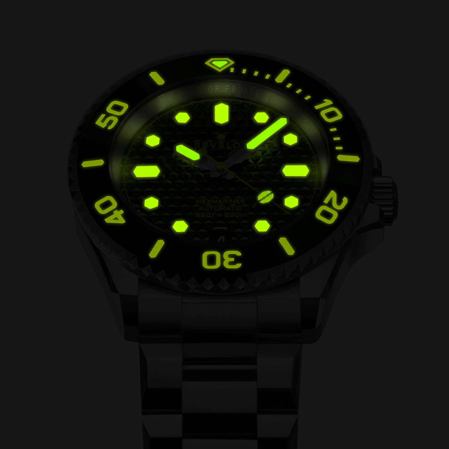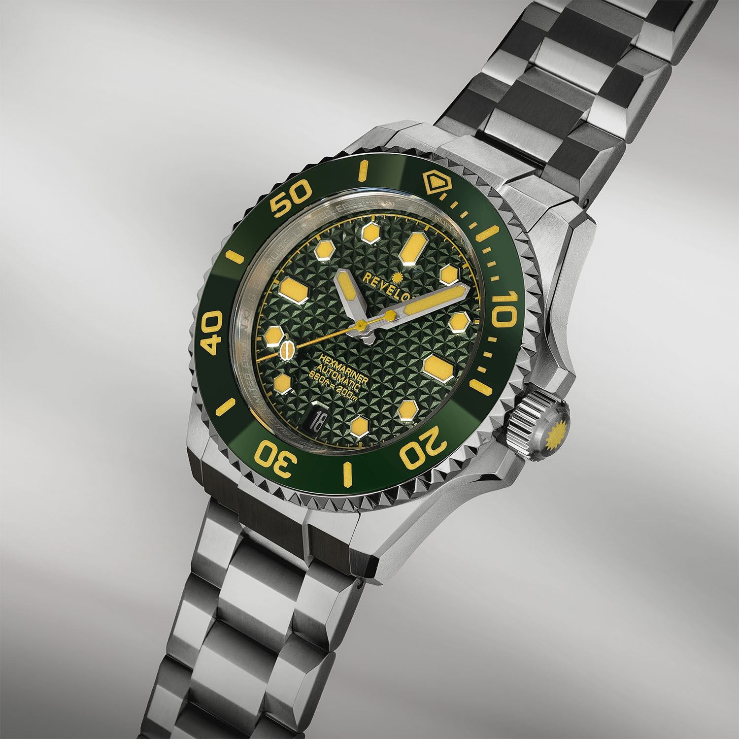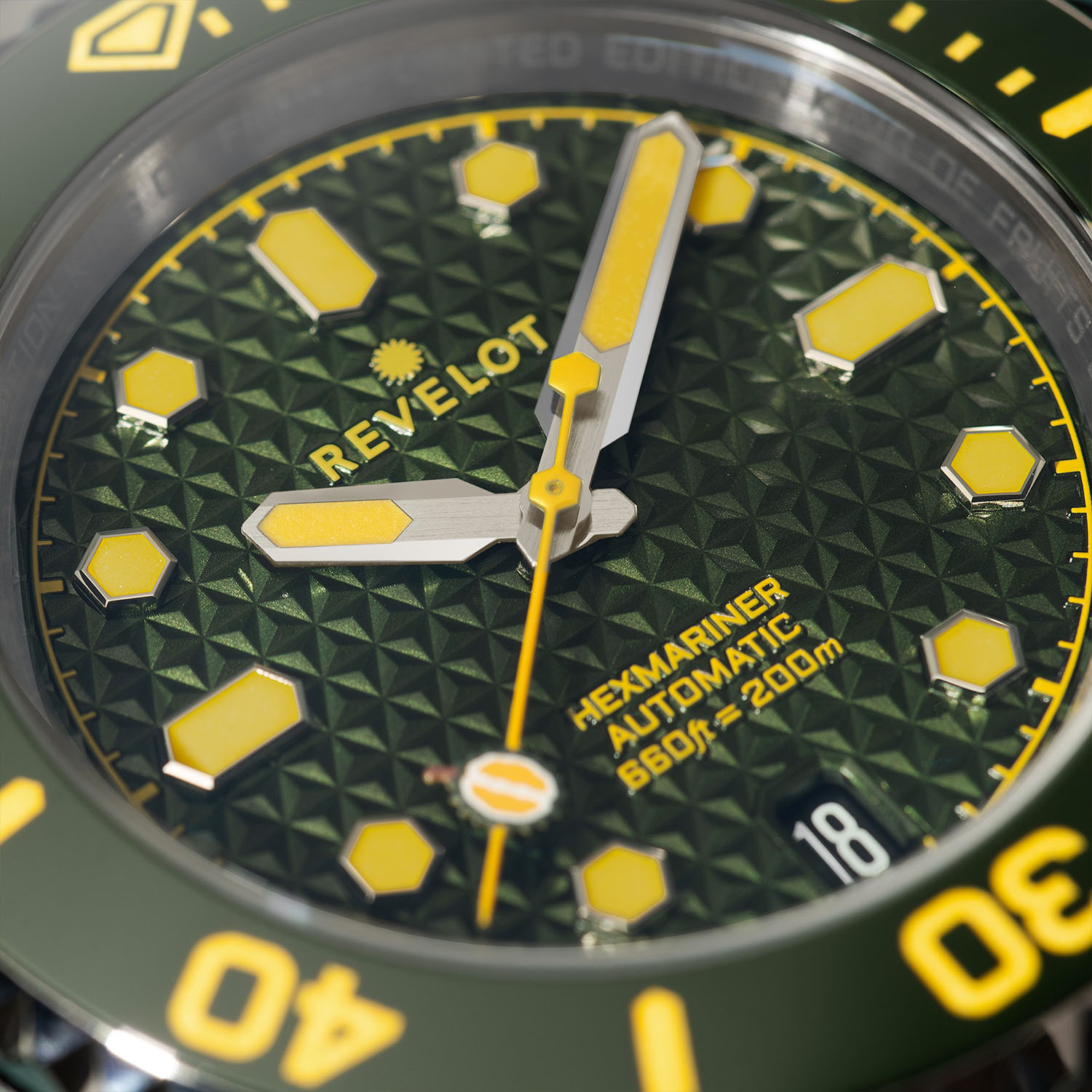 The stainless steel case is modelled after the brand’s conventional Hexmariner 39 diver with a 39mm diameter and height of 13mm (48mm lug-to-lug). The unidirectional rotating bezel has a durian-green ceramic insert with a lume-filled diver’s scale that matches the dial colours. The bezel’s knurling even has a spiky design, while the guarded crown is signed with a yellow Revelot logo (that just happens to be spiky). An AR sapphire crystal protects the dial, while the sapphire case back has a printed durian silhouette in colour. Water resistance is 200 metres, so it’s a serious diver and even comes with three 20mm bracelet options – one with a glide-lock clasp, one with a five-hole micro-adjusting clasp and a new five-link design, all with quick release levers.