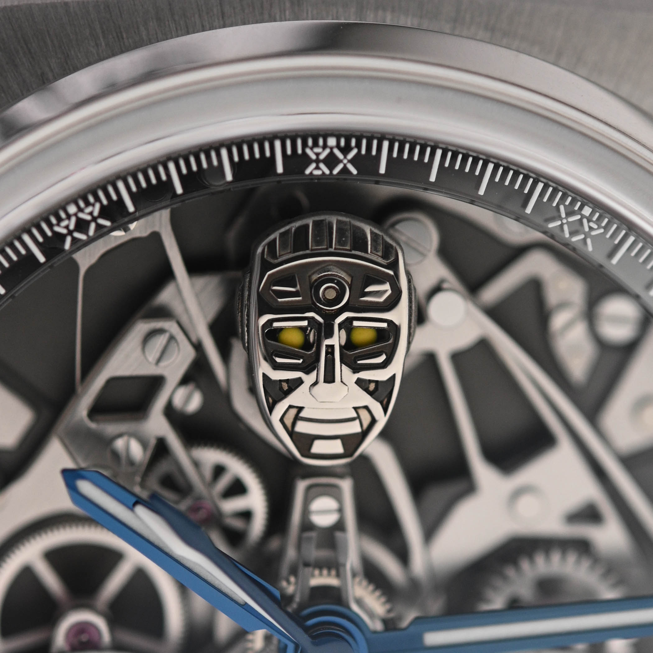 Just like the first iteration of the Antarctique Rattrapante, the engine of this new limited edition is the SXH6 calibre, developed in partnership with Chronode. While much of the movement’s architecture appears unchanged, some differences and upgrades distinguish this version. The SXH6 self-winding calibre is still distinguished by its dial-side split-seconds chronograph, showcasing its intricacies on the front rather than concealing them on the back, as is typically the case. This monopusher chronograph features a horizontal clutch and two column wheels: one dedicated to the rattrapante and the other to the chronograph – the latter now concealed beneath the robot head. Integrated into the movement, his eyes change colour with the chronograph’s functions: yellow when running, red when stopped, and blue when reset. The robot’s head, created by MD’Art, is a miniature work of art; it is cut, hand-polished and laser-engraved, and each of its eyes is micro-painted by hand using neon tones of the three colours.