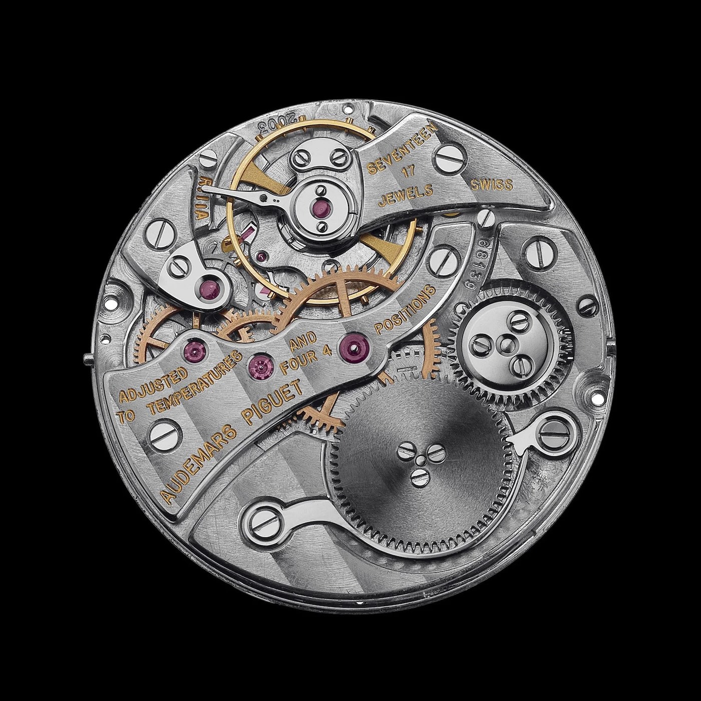 Back to wristwatches, the post-war trend for tuxedo watches and ultra-thin timepieces reopened the race for the thinnest mechanical movement for a wristwatch. Most likely in 1953 (sources are not precise enough on this topic; some indicate an introduction in 1946), Audemars Piguet, with the help of Jaeger-LeCoultre and Vacheron Constantin, released the Calibre 2003 (also known as the Calibre 1003 at Vacheron and Calibre 803 at JLC). This movement, using some of the ideas of the Piguet Calibre 21 (its 20-year patent having expired), was only 1.64mm in thickness. Audemars Piguet had exclusivity for two years before Vacheron Constantin introduced their own version, Calibre 1003, in 1955.