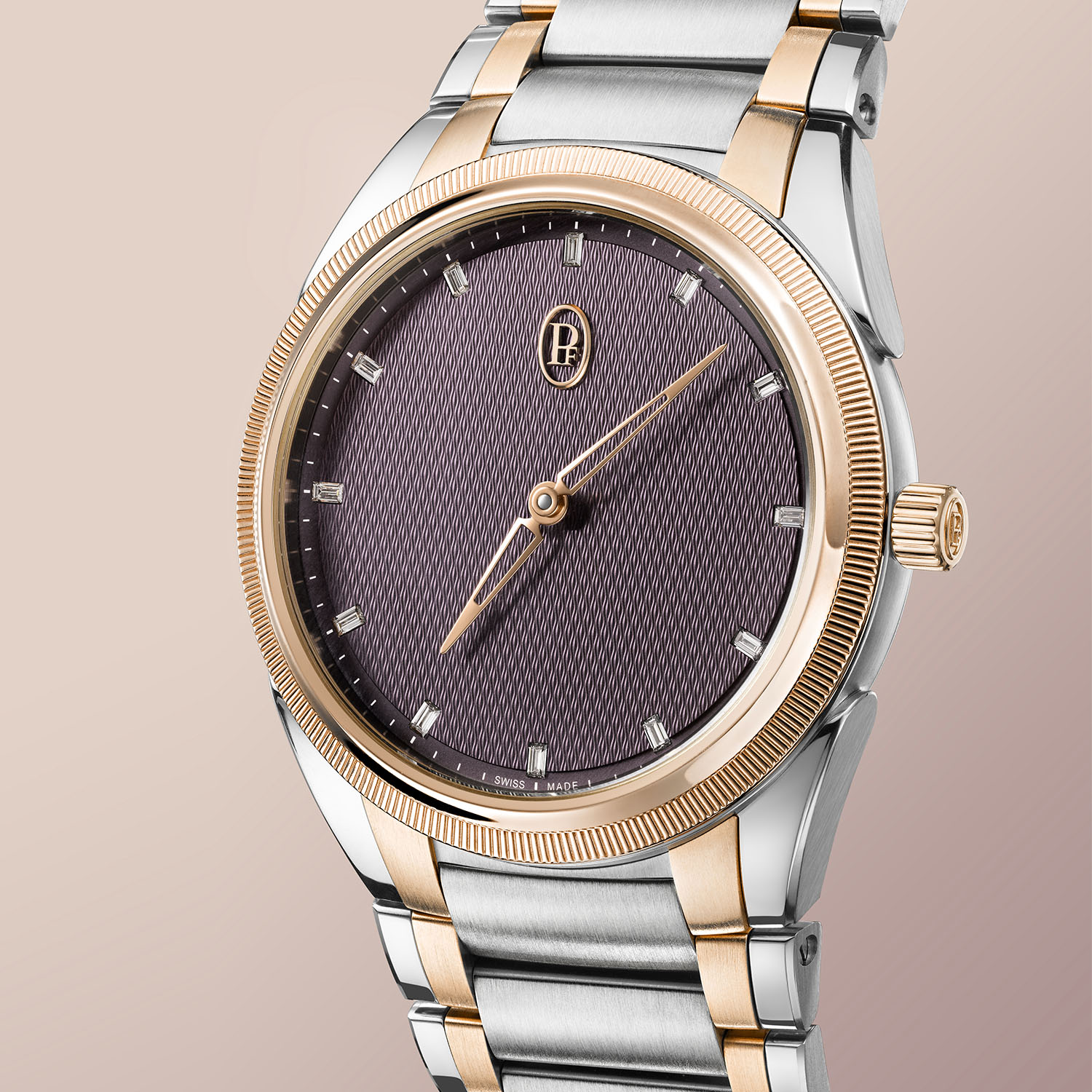 Catering to a wider range of wrist sizes, the 36mm model eliminates the date window featured on the 40mm reference. A positive decision for many, the removal of the date window highlights the dial’s elegant minimalism. Decorated with a refined hand-guilloché grain d’orge (barleycorn) pattern, the dial’s lack of superfluous elements allows you to appreciate the subtle texture of the guillochage. The twelve baguette-cut diamonds hour markers are indicated by the skeletonised rose gold delta-shaped hour and minute hands, and the only other element on the dial is the oval gold cartouche at noon with the letters “PF”.