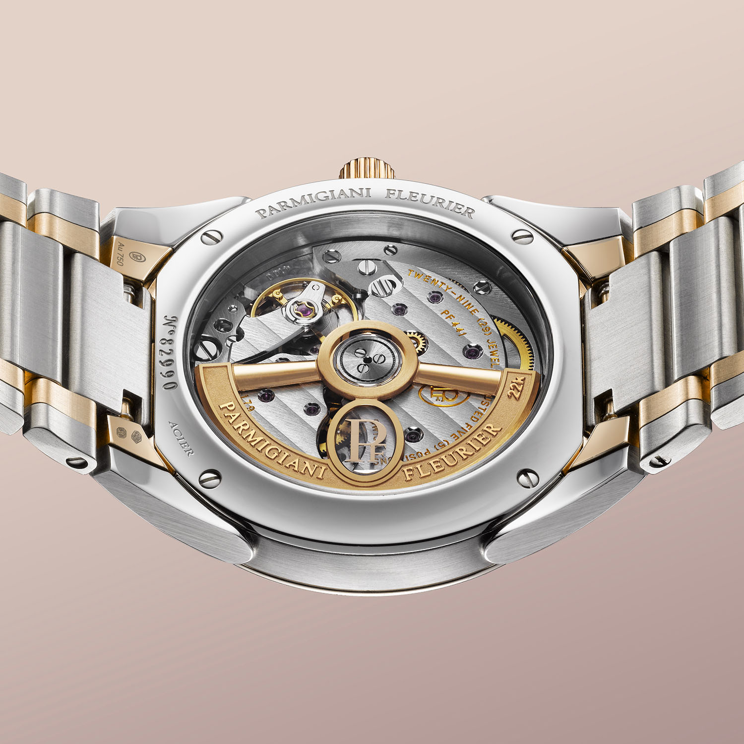 The new model comes in an attractive two-tone stainless steel and 18k rose gold case and bracelet. Used to accentuate specific design details, rose gold is featured on the signature knurled bezel, the crown, and on the second and fourth links of the integrated bracelet. Sharing the 36mm diameter and slim 8.6mm height of its more compact siblings, the case features Michel Parmigiani’s beautiful teardrop-shaped lugs and is decorated with a mix of brushed and polished finishes. Fitted with a screw-down crown, the case lives up to its luxury sports watch classification and is water-resistant to 100 metres.