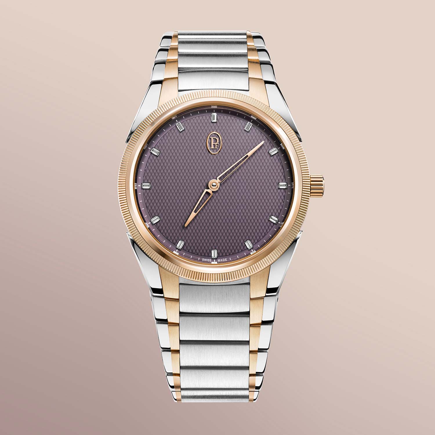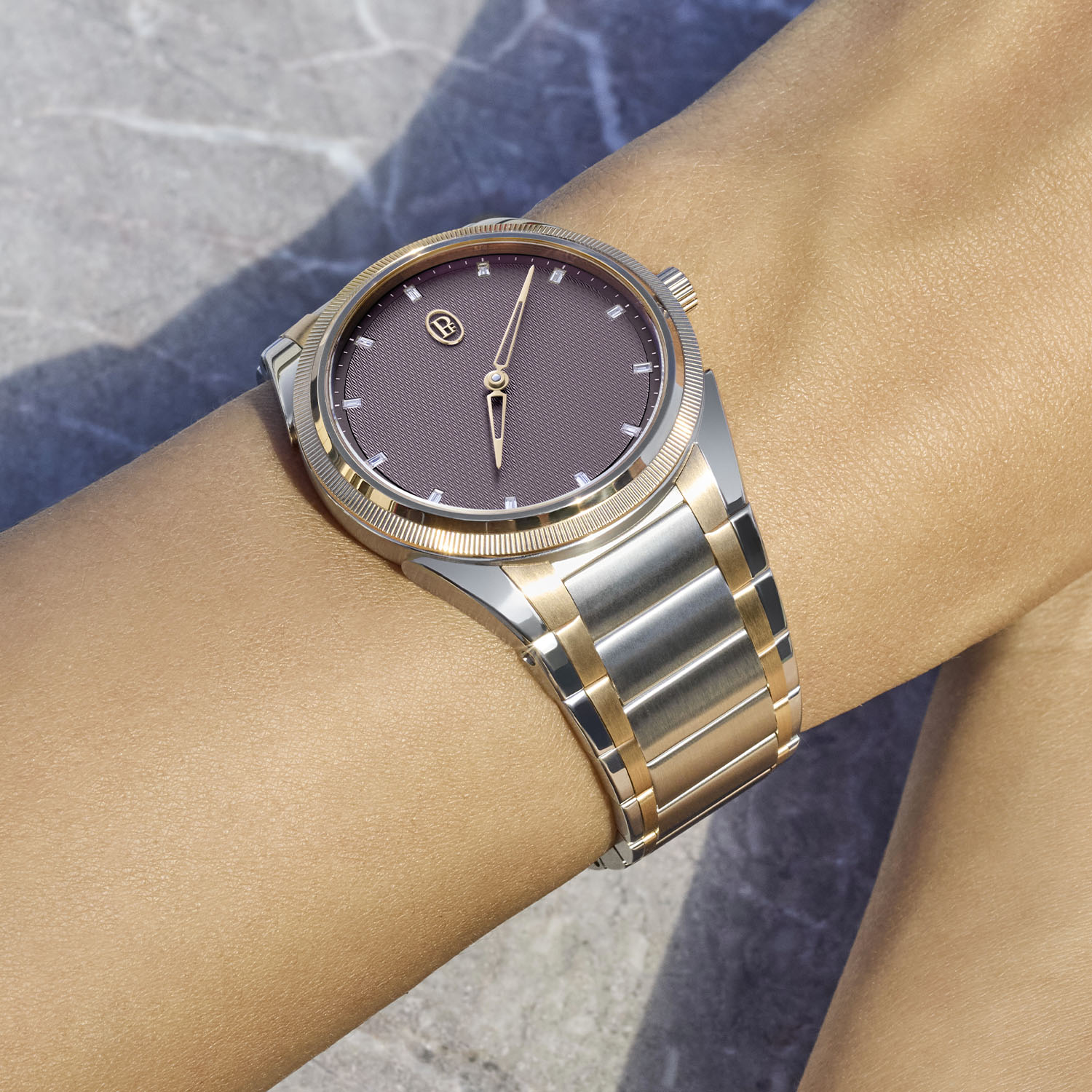 Parmigiani Fleurier, the elite watch brand founded by master restorer and watchmaker Michel Parmigiani in 1996, underwent a management change in 2021 with the appointment of Guido Terreni. Terreni’s roadmap for Parmigiani involved streamlining the collections and focusing on a new collection derived from Michel Parmigiani’s Tonda watch. Released that same year, the Tonda PF is a lineup of refined luxury sports watches with guilloché dials, integrated bracelets and in-house movements. Responding to requests for a more compact, unisex case size, Parmigiani produced a 36mm version of the Tonda PF Micro-Rotor, the most straightforward time-only model. The latest reference is a two-tone rose gold and steel Tonda with a rich ruby dial.