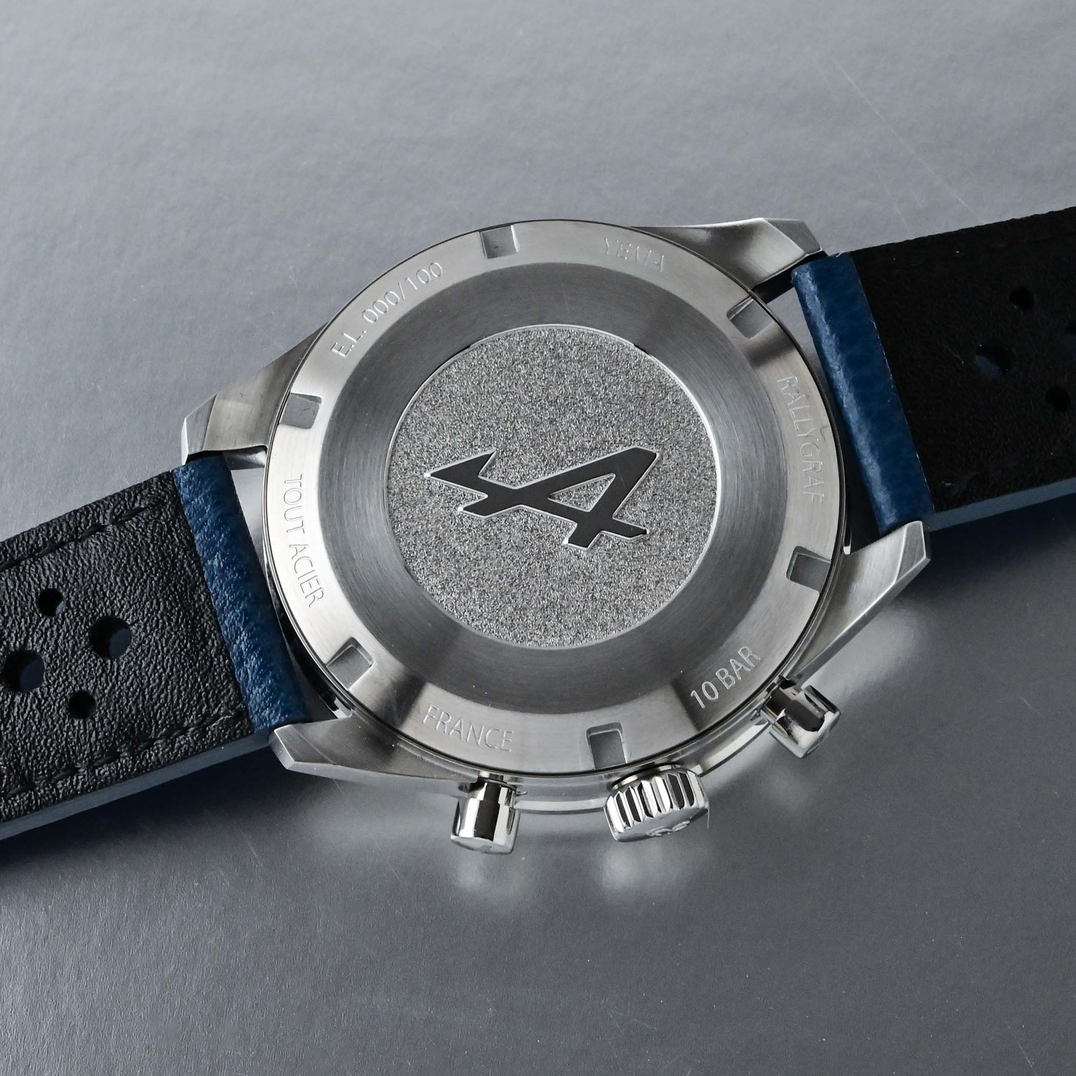 The solid caseback bears a high-pressure stamping of the Alpine A110 emblem, with each watch individually numbered 000/100. The watch is offered on a French-made perforated rally strap in Alpine blue leather, tailored to match the dial and fitted with a polished pin buckle. Each piece is assembled in France at Yema’s Morteau workshop and comes with a two-year international warranty.